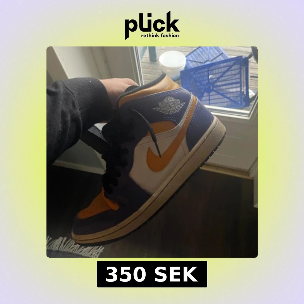 Säljer ett par Nike Air Jordan 1 mids i Lakers-färger. Skorna har lila och gula detaljer med vit bas, svart snörning och klassisk Air Jordan-logga på sidan. Ovandelen är i skinn och sulan är svart. Perfekta för dig som vill sticka ut med en ikonisk sneaker.