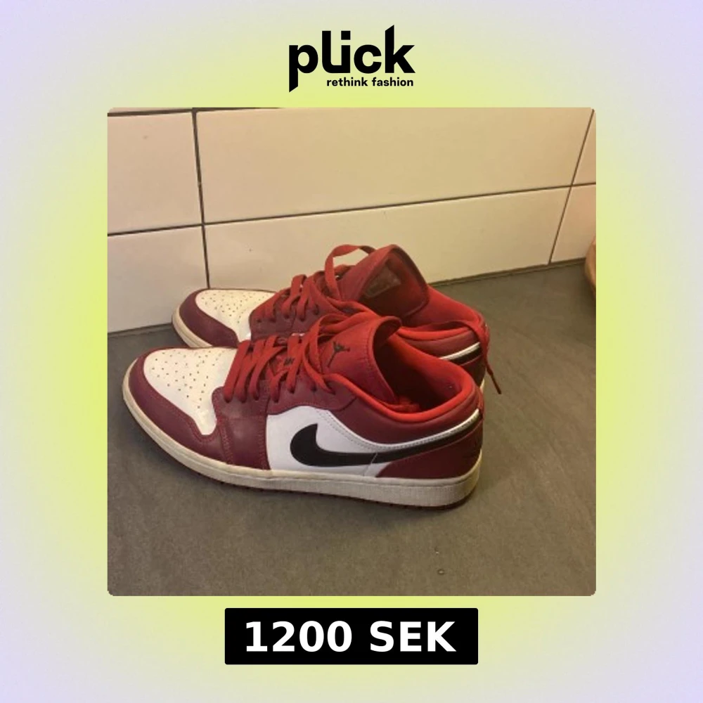 Säljer ett par Nike Air Jordan 1 Low i rött och vitt med svarta detaljer. Klassisk siluett med svart swoosh, perforerad tåbox och röda skosnören. Skorna har en låg profil och är tillverkade i skinn och syntet. Perfekta för dig som gillar streetwear och sneakers med attityd.
