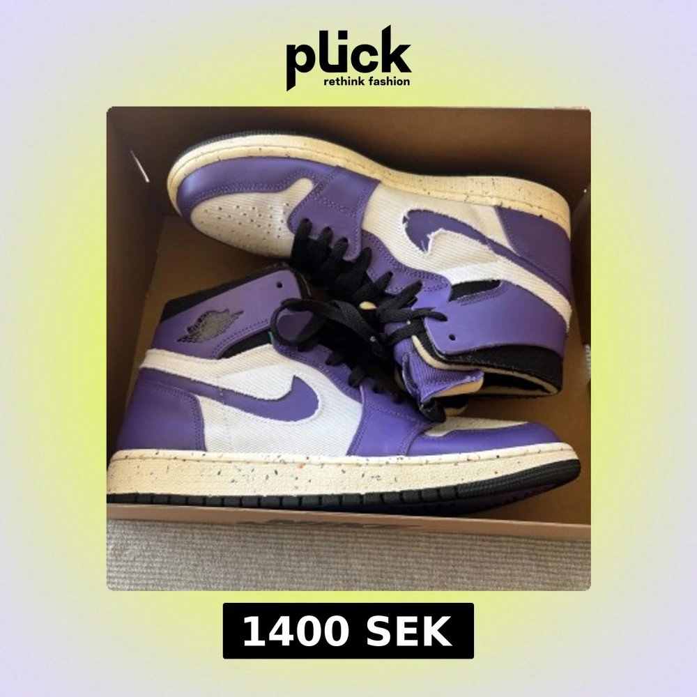 Nike Air Jordan 1 High i lila och vitt med svarta skosnören och detaljer. Ovandel i kombinerat skinn och textil, klassisk Jordan-logga på sidan och Zoom Air-märke på plösen. Sulan är vit med färgade prickar och svart yttersula. Skorna är enbart testade och är i nyskick. Kvitto finns även om så önskas! skorna kostade 1700 nya men har stigit i pris så detta är en dunder deal!