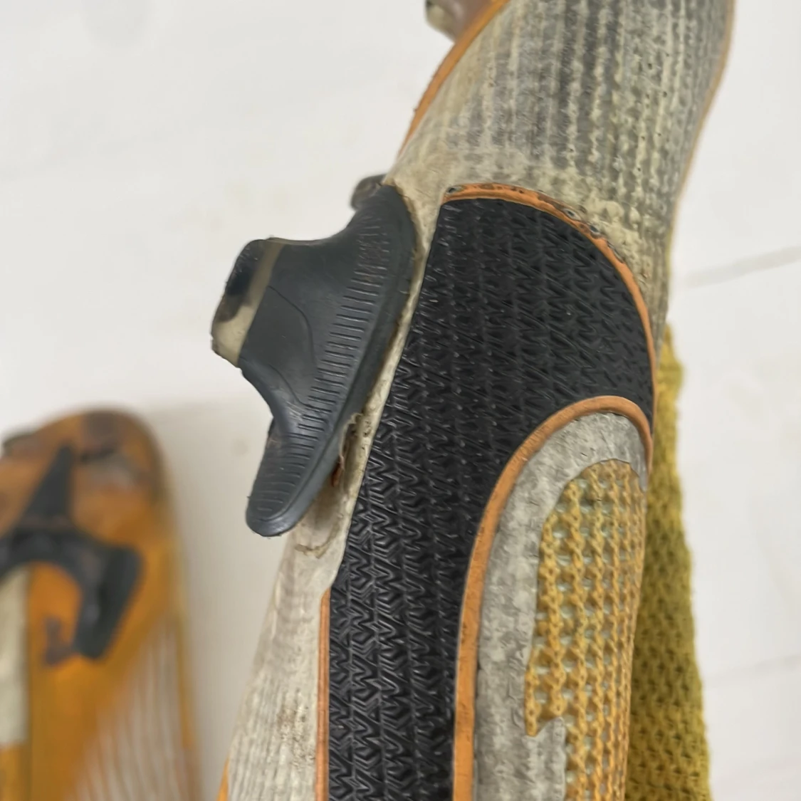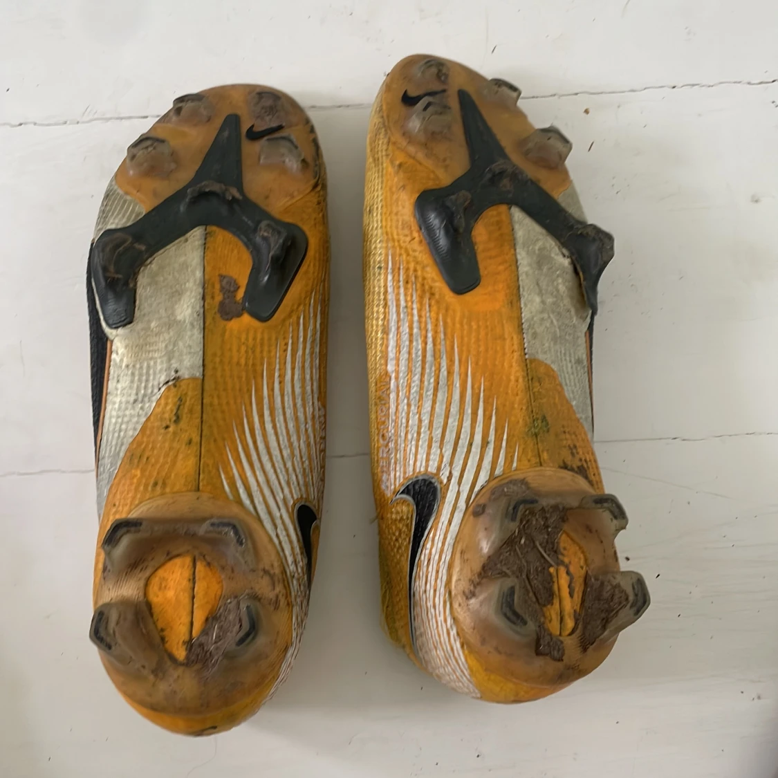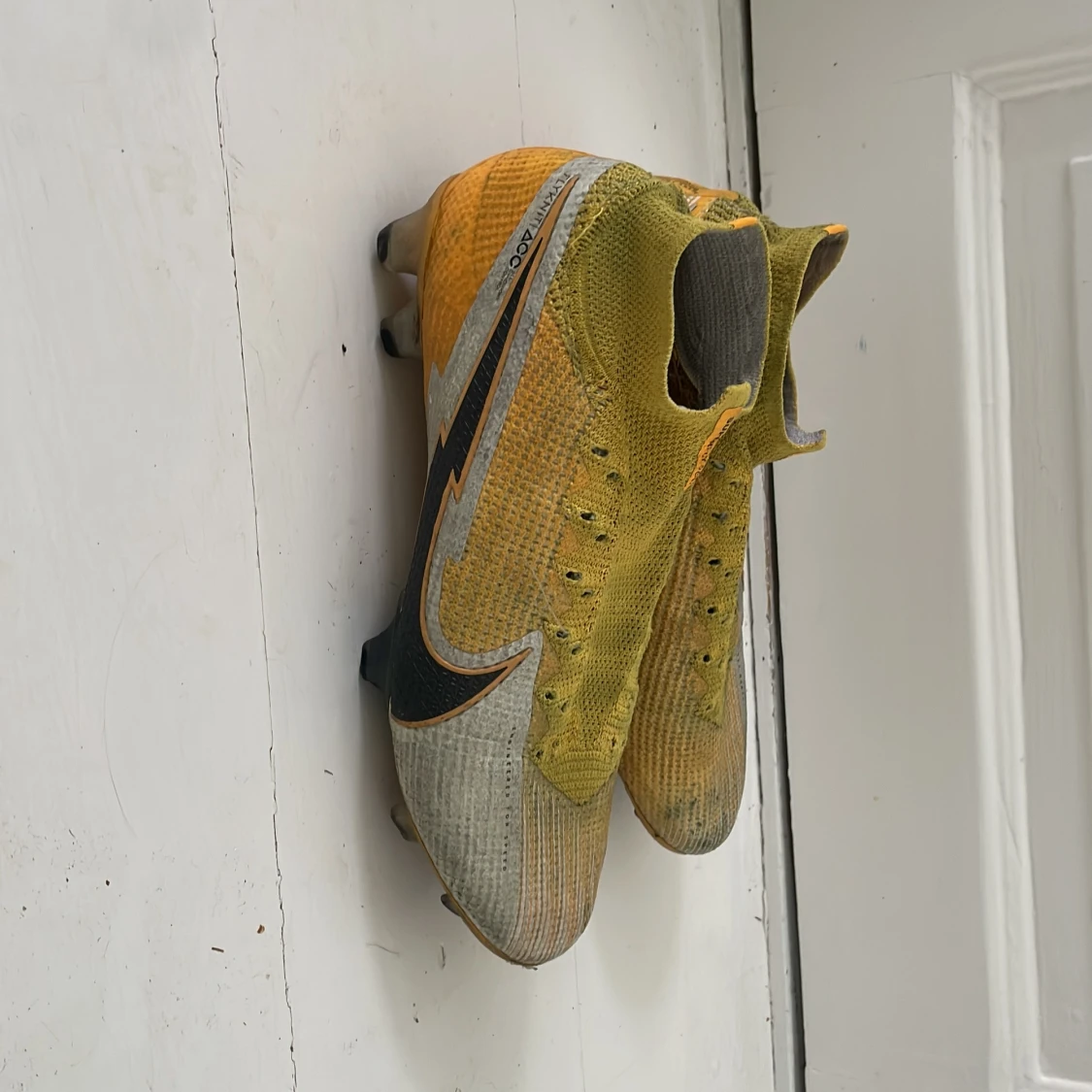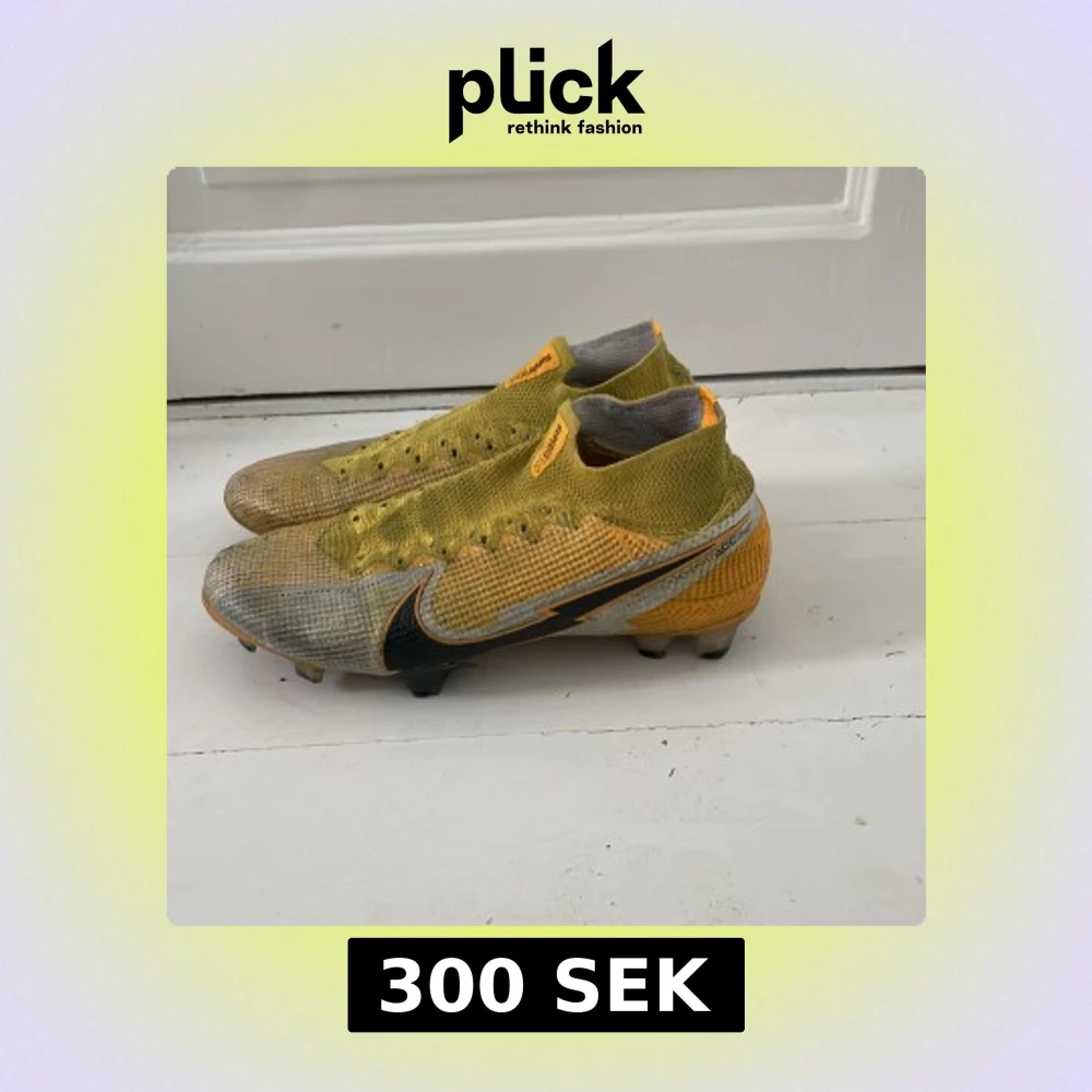Säljer ett par Nike fotbollsskor med högt skaft i stickad syntet. Skorna är gula med inslag av grått och svart, har snörning och en stor svart Nike-logga på sidan. Sulan har fasta dobbar för gräsplan och detaljer i orange och svart. Perfekt för dig som vill sticka ut på planen. Men pris går att diskuteras eftersom ena skon är lite trasig på ens sida om ni ser på bilden