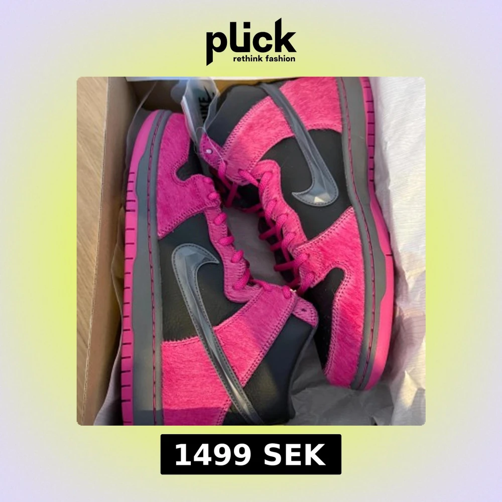 Nike SB Dunk High Run The Jewels är en exklusiv och kraftfull sneaker med en ovandel i mörkrosa och lila mocka, kombinerad med en metallic Swoosh som ger ett unikt uttryck. Modellen har rund tå, platt sula och klassisk snörning, och levereras med fyra olika skosnören i rosa, gult, grått och grönt, så du kan variera looken efter smak. Dessutom kan du byta ut de metallfärgade snörbrickorna från guld till svart för en mer personlig stil. Skorna är helt nya och aldrig använda.