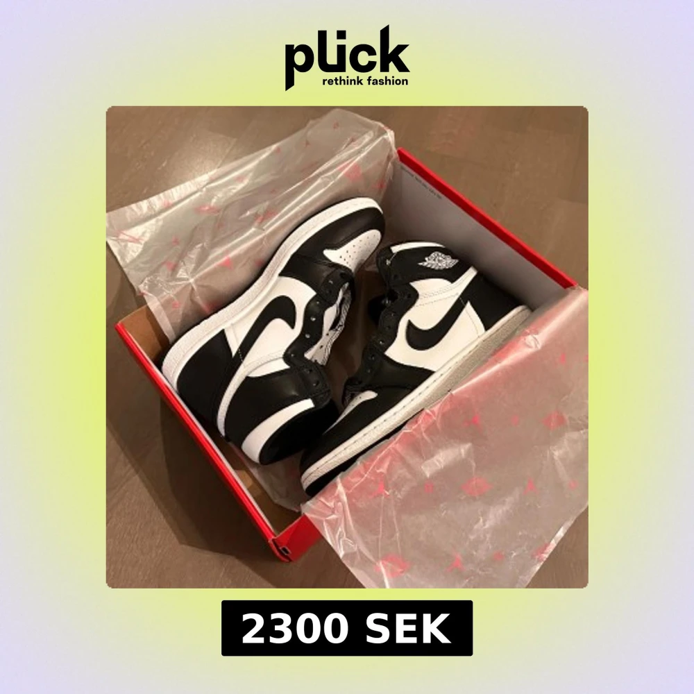 Säljer ett par Nike Air Jordan 1 i svart och vitt skinn. Klassisk high-top siluett med svart swoosh, snörning och vit yttersula. Ikonisk Air Jordan-logga på sidan. Perfekta för dig som vill ha en clean och tidlös sneaker med streetkänsla.