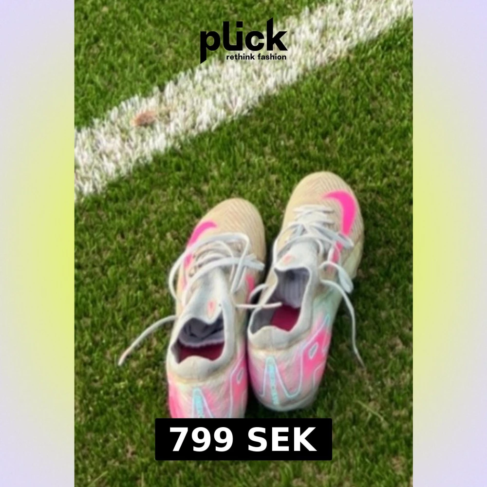 Säljer ett par Nike fotbollsskor i beige med rosa detaljer och snörning. Skorna har en randig struktur på ovandelen och en sula med gröna och rosa dobbar för bra grepp på planen. Perfekta för dig som vill sticka ut på fotbollen!