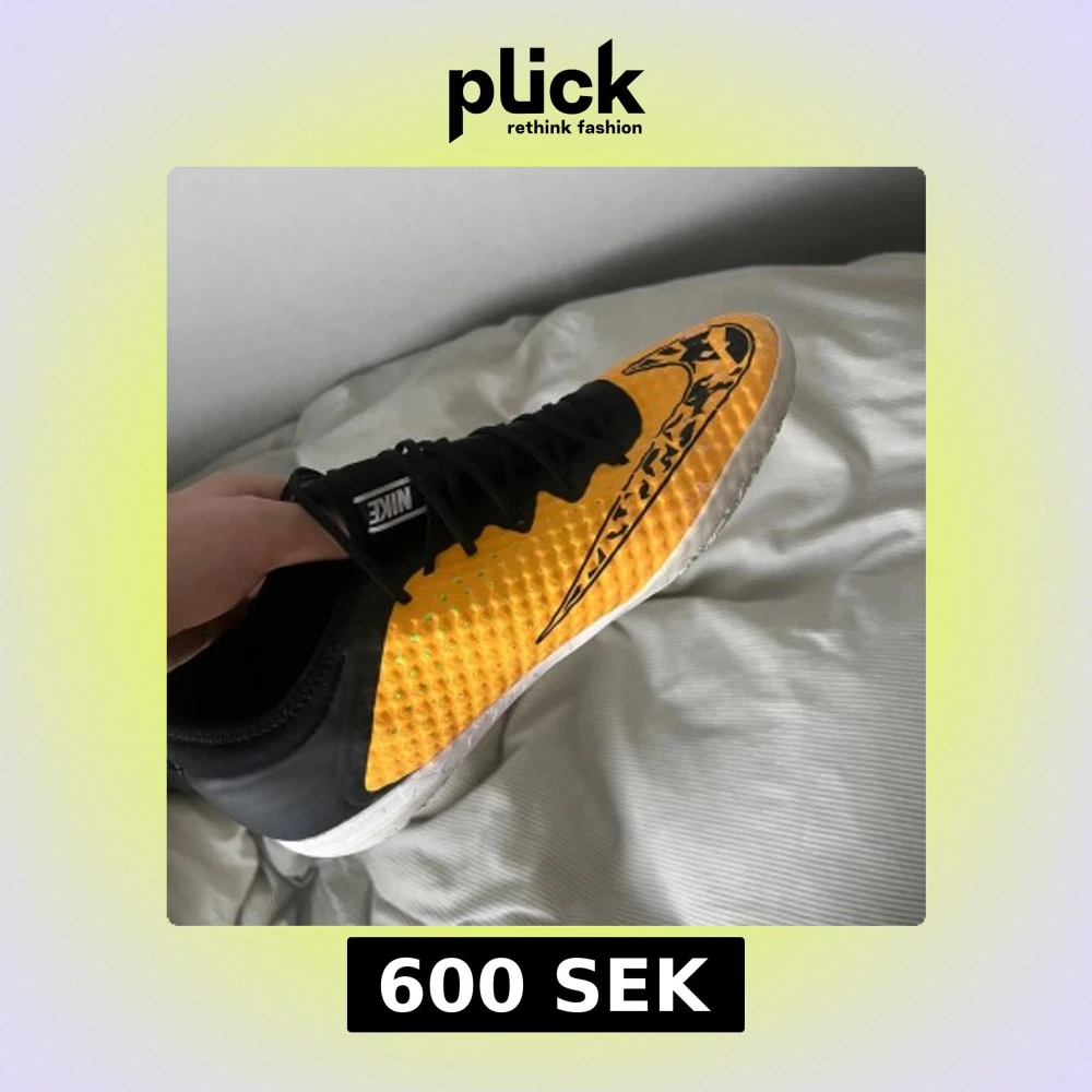 Säljer ett par Nike fotbollsskor med grym design i gult och svart, stora mönstrade swoosh-loggor och vita sulor med neon-gula detaljer undertill. Skorna har snörning och är tillverkade i syntetmaterial med prickiga detaljer på ovansidan. Perfekt för dig som vill sticka ut på planen.