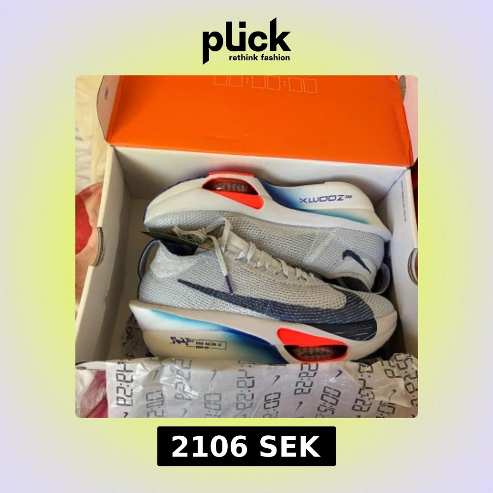 Nike ZoomX sneakers med stickad ovandel i silvergrått och stora blå swoosh-loggor. Sulan är vit med inslag av blått och neonorange detaljer, samt synliga Air Zoom-enheter. Perfekta för löpning och träning, med snörning och modern design.