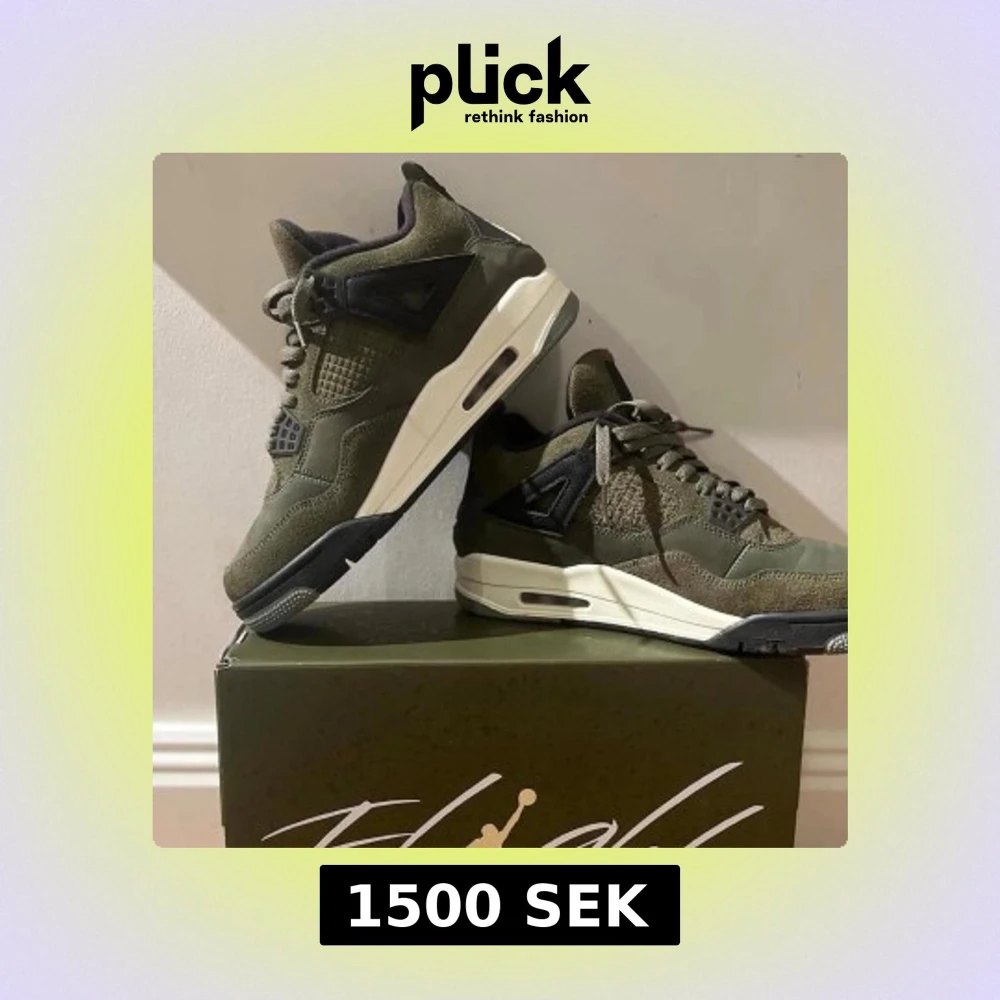 Säljer ett par Nike Jordan 4 sneakers i olivgrönt med svarta och vita detaljer. Skorna har en chunky siluett, meshpaneler och snörning. Materialmix av mocka och syntet ger en cool textur. Ikonisk Jumpman-logga på plösen och platt sula med luftdämpning.