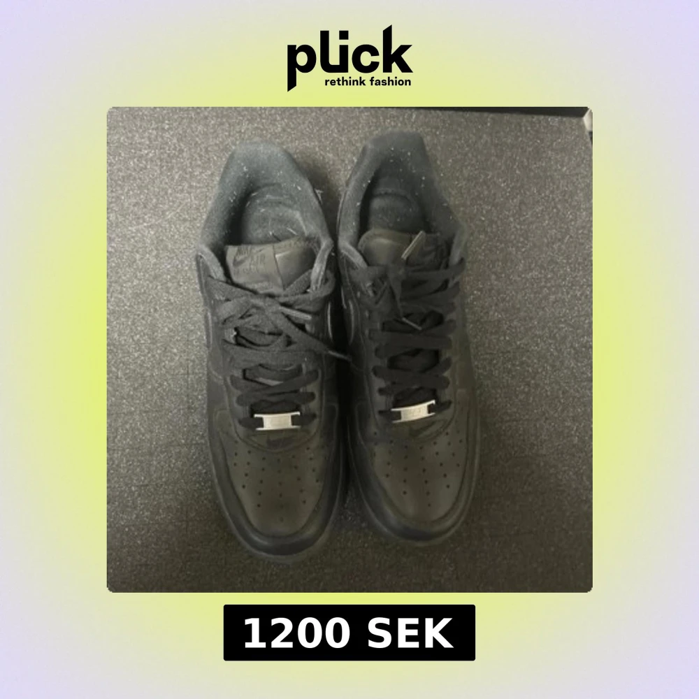 Använda 2 gånger. Säljer ett par helsvarta Nike Air Force 1 Low i skinn med klassisk siluett och perforerad tå. Skorna har svarta snören och medföljer extra Supreme-senor för en unik touch. Perfekt för dig som gillar streetwear och vill ha en clean look.