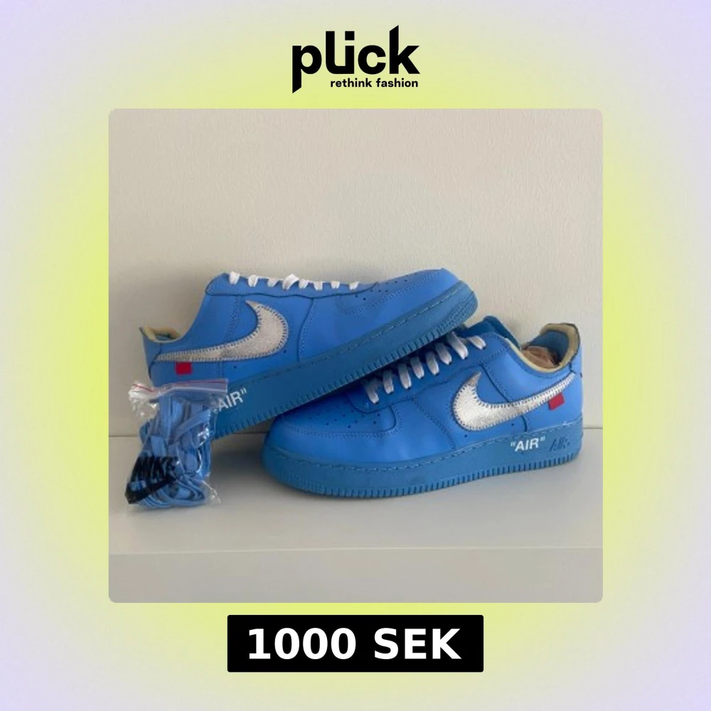 Nike Air Force 1 Off-White i en riktigt snygg blå färg med silvrig swoosh och vita skosnören. Skorna har klassisk låg siluett, perforerad tå och extra blåa skosnören medföljer. Detaljer som Off-White-typisk text och röd tag på sidan. Perfekta för dig som vill sticka ut. Box medföljes ej och kvitto.
