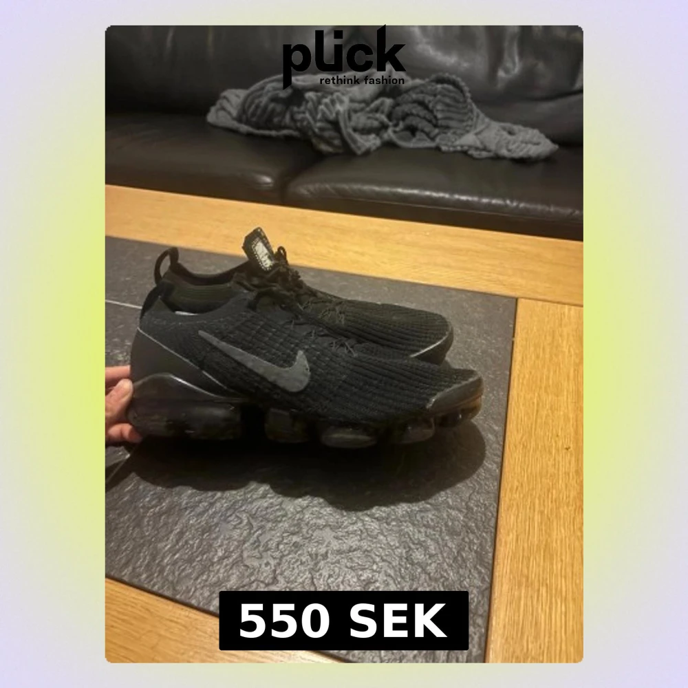 Snygga helsvarta Nike Vapormax sneakers med stickad ovandel och tydlig svart swoosh på sidan. Skorna har en unik plattformsula med synliga luftbubblor och snörning framtill. Perfekta för dig som gillar sportig och modern stil.