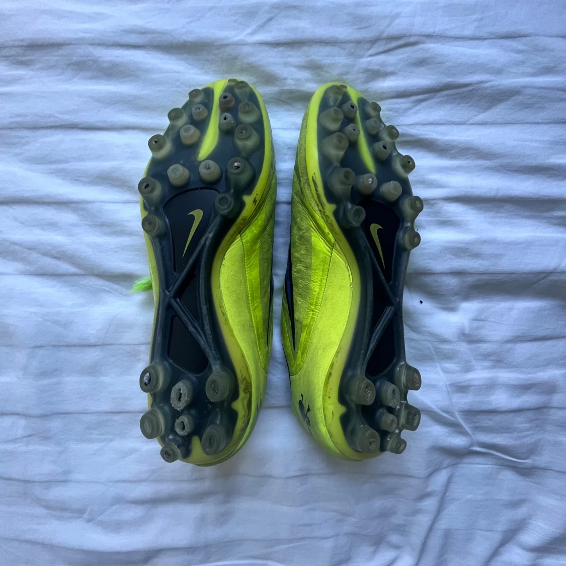 Säljer ett par Nike fotbollsskor i neon-gult med blå detaljer och svart sula. Skorna har snörning och är tillverkade i syntetmaterial. Perfekta för dig som vill sticka ut på planen med en riktigt sportig look. Sulan har dobbar för bra grepp på gräs. Storlek 42