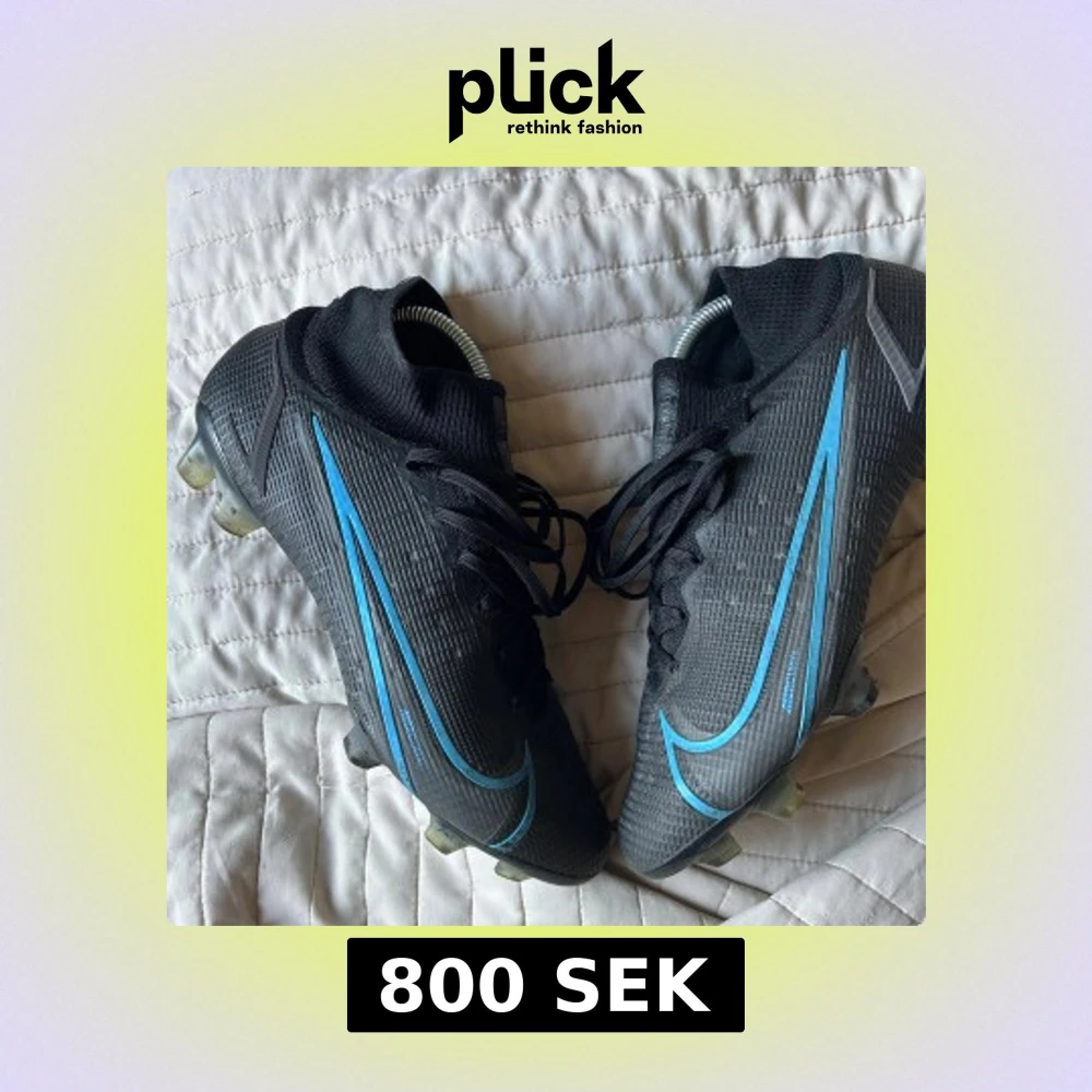 Säljer ett par svarta Nike fotbollsskor med högt skaft och blå swoosh-detaljer på sidorna. Skorna har snörning och mönstrad ovandel i syntetmaterial samt fasta dobbar för spel på gräs. Perfekta för dig som vill ha stilrena och sportiga skor på planen.