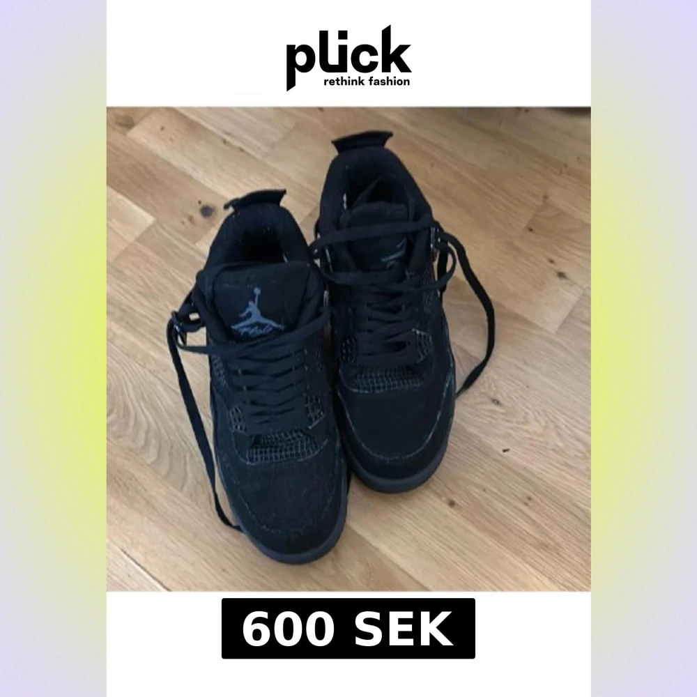 Säljer ett par svarta Nike Air Jordan 4 sneakers med klassisk Jumpman-logga på plösen och sulan. Skorna har snörning, meshdetaljer och en chunky sula med synlig Air-enhet. Materialet är en mix av skinn och syntet, med coola paneler och detaljer i mörk ton.