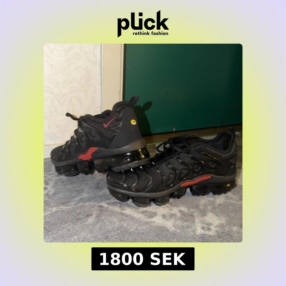 Nike Air Vapormax Plus i svart med röda detaljer och synlig air-sula. Ovandel i mesh och syntet med coola vågformade paneler, svarta snören och diskret Nike-logga på sidan. Sulan är chunky och ger en futuristisk vibe. Perfekta sneakers för dig som gillar streetstyle. Den är helt nytt säljer den på grund av fel storlek