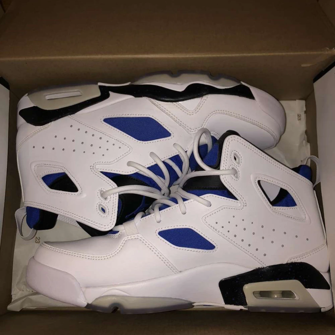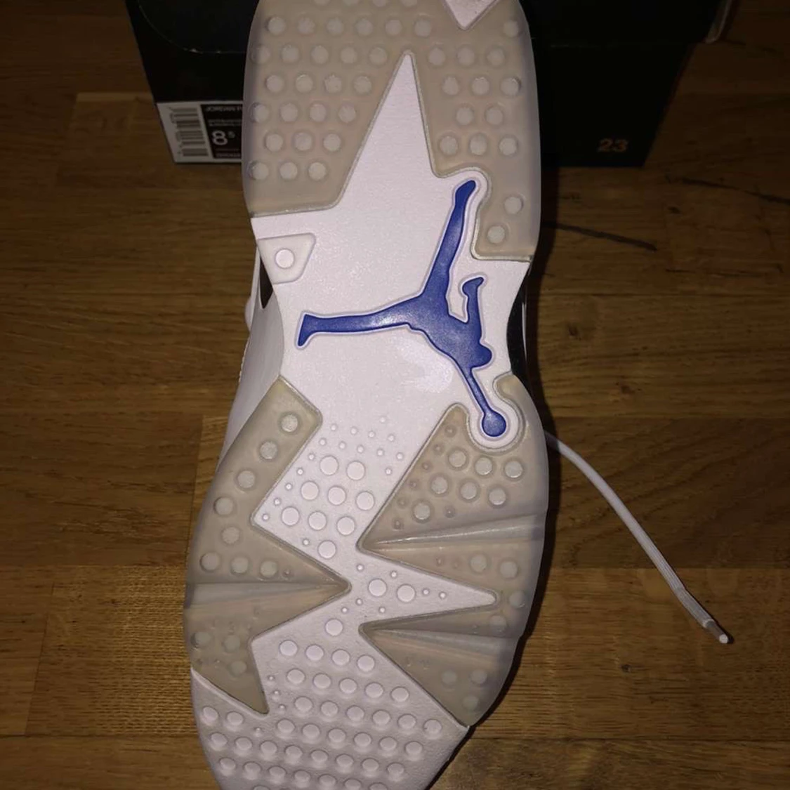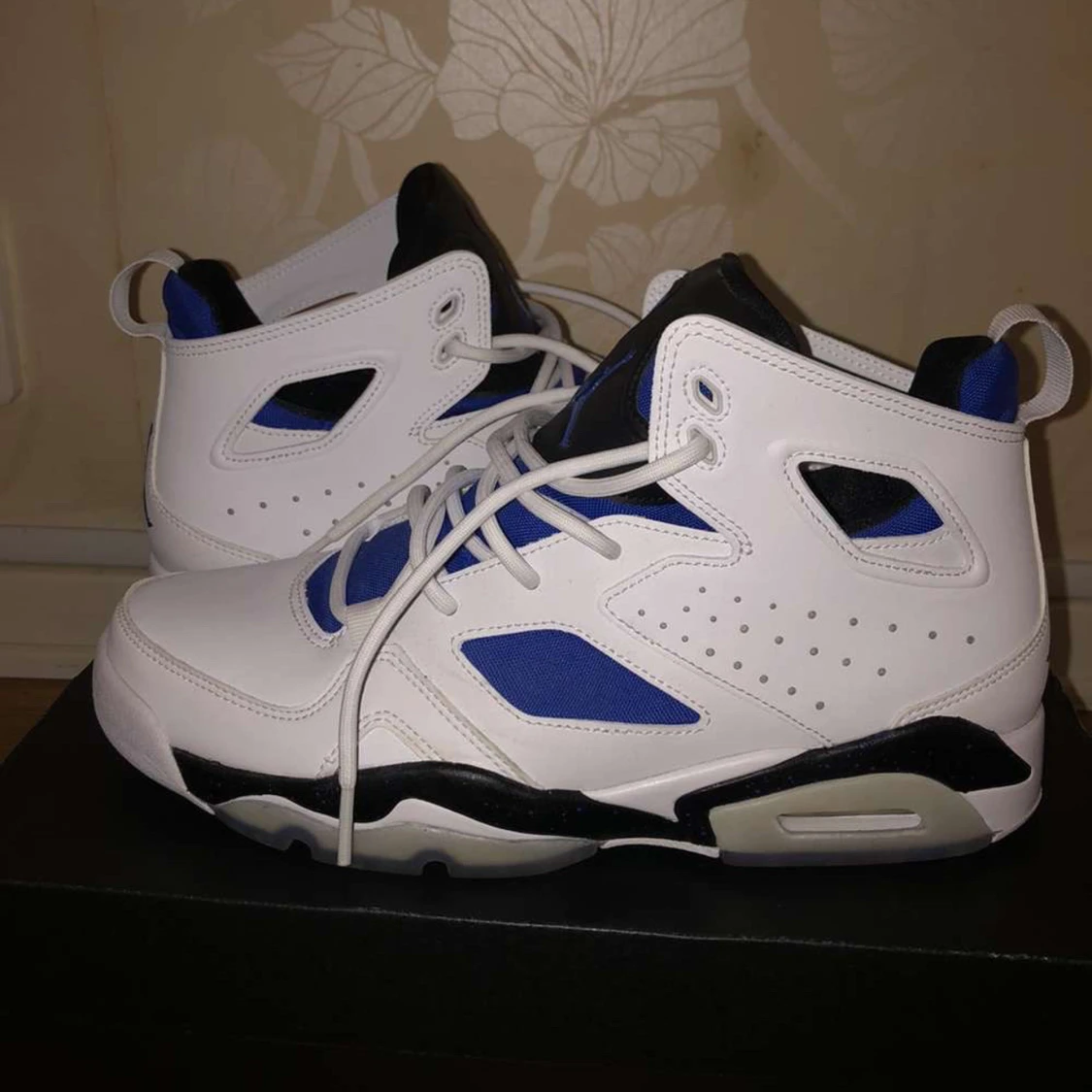 Säljer ett par helt nya Jordan sneakers hyper blue white och med svarta detaljer. Skorna har klassisk hög siluett, snörning och den ikoniska Jumpman-loggan broderad på hälen. Säljer eftersom fick fel storlek.