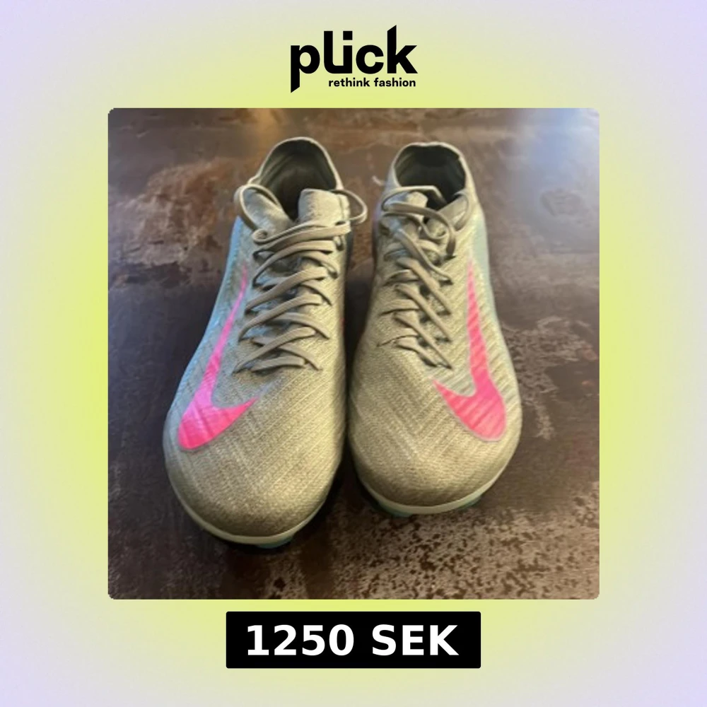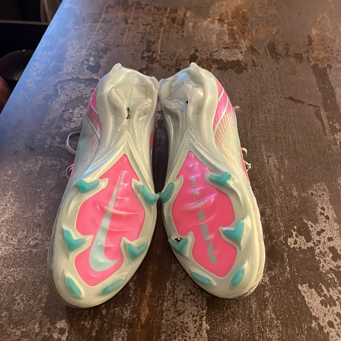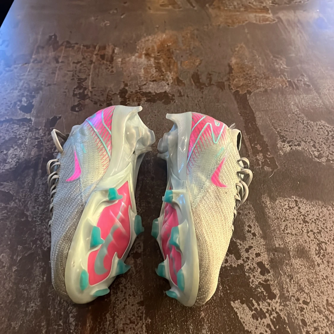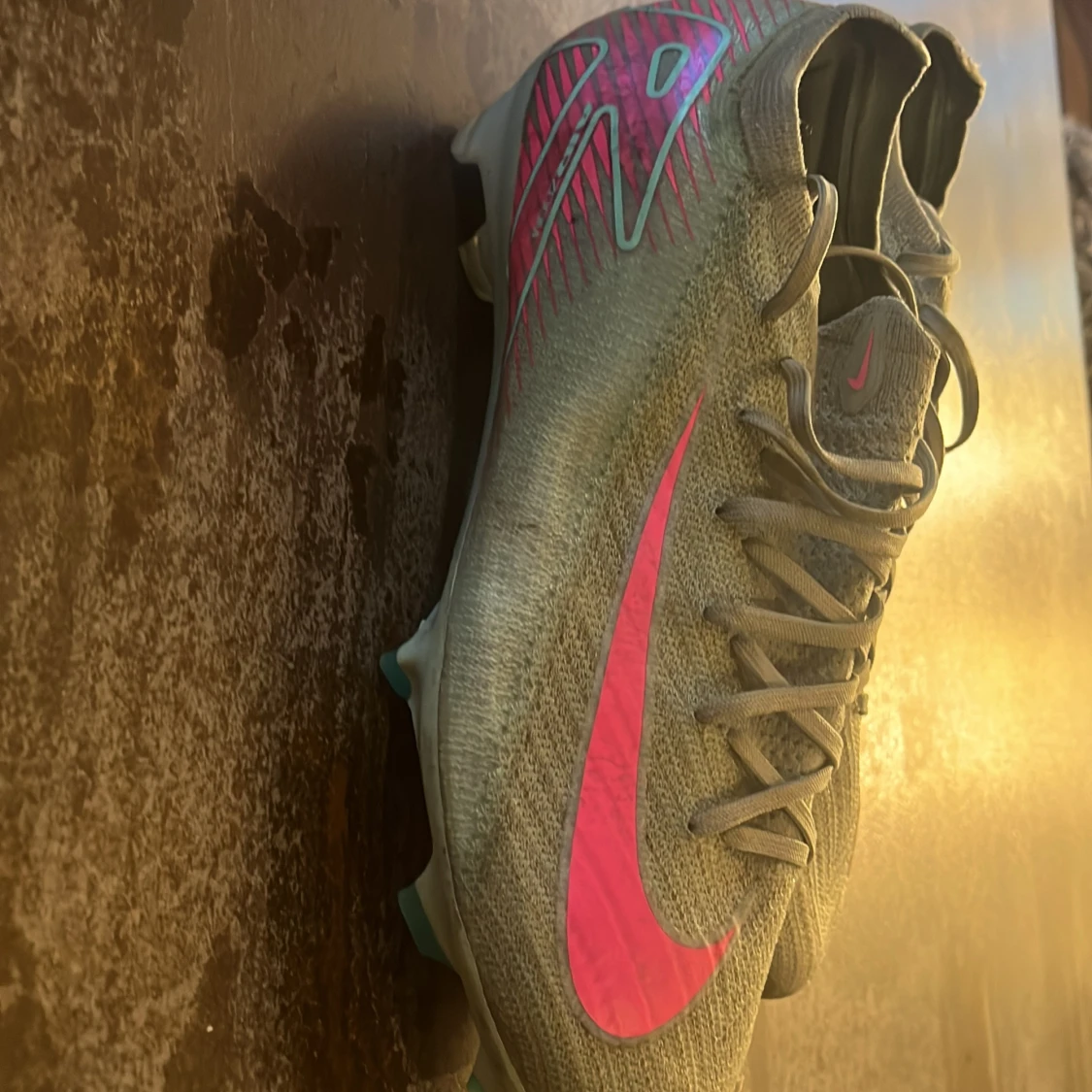 Säljer ett par Nike mecurial elite fotbollsskor i grått med stora rosa swoosh-loggor och coola turkosa dobbar undertill. Skorna har snörning och är tillverkade i syntetmaterial för bästa grepp och känsla på planen. Perfekta för dig som vill sticka ut med stil på matchen! Storlek 42