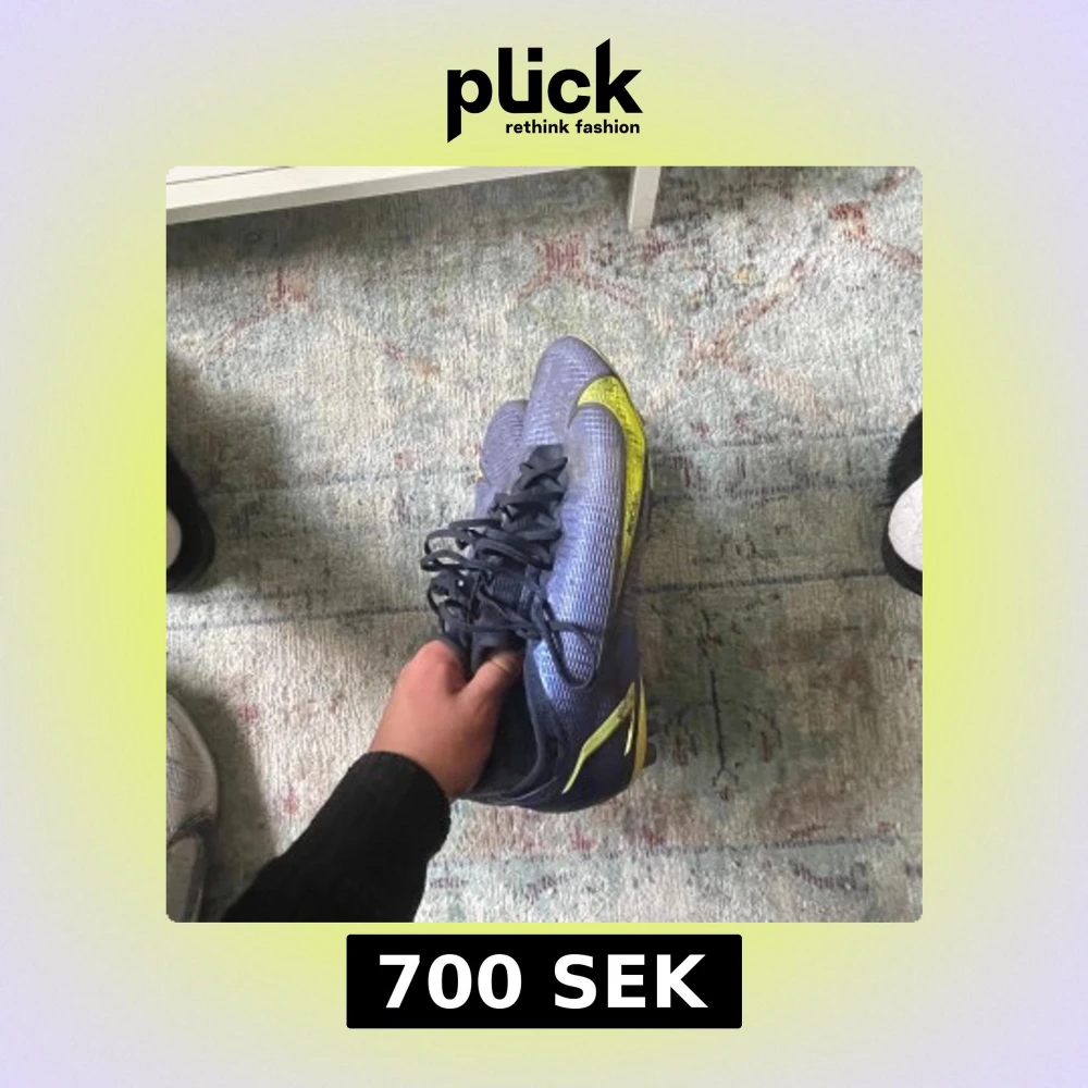 Snygga blå Nike Mercurial fotbollsskor med gula detaljer och snörning. Perfekta för fotbollsplanen med sin sportiga design och slitstarka material.