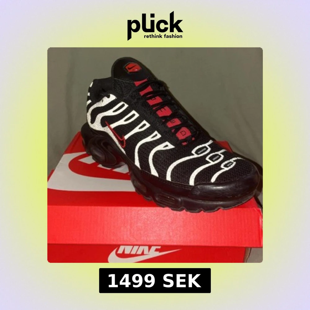 Nike Air Max Plus sneakers med svart mesh-överdel, vita zebraränder och röda detaljer. Snygg röd Swoosh på sidan och AIR-text på plösen. Platt sula meds synliga luftkuddar och robust yttersula. Perfekt för dig som gillar djärv stil och streetwear.