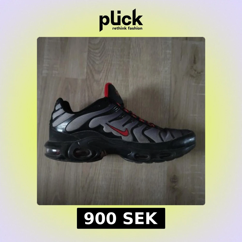 Snygga Nike Air Max Plus sneakers i svart och grå med röda detaljer. Skorna har en unik design med vågformade linjer och en synlig Air Max-dämpning i sulan för extra komfort. Perfekta för både stil och funktion.