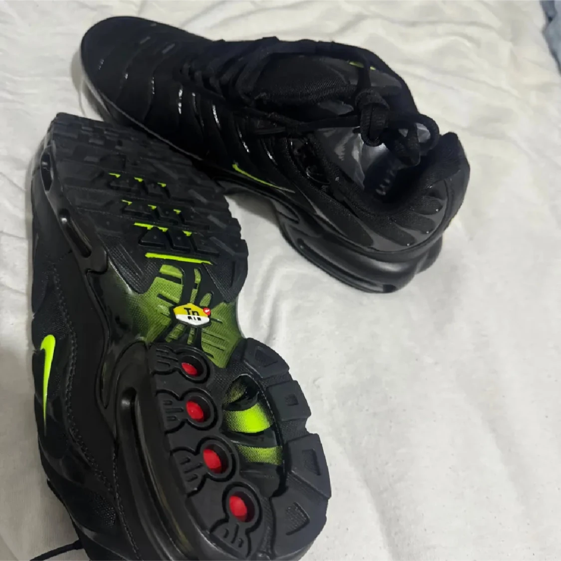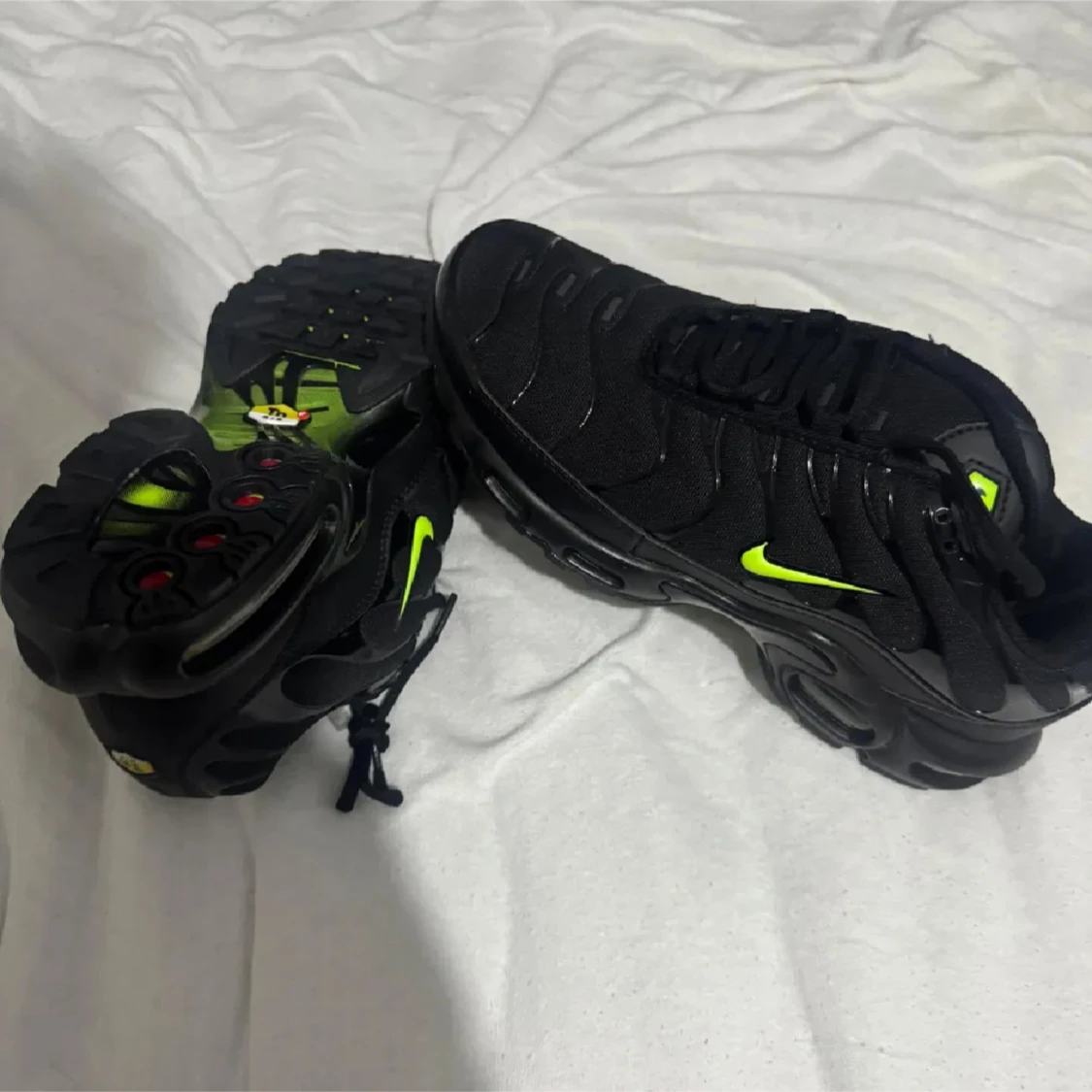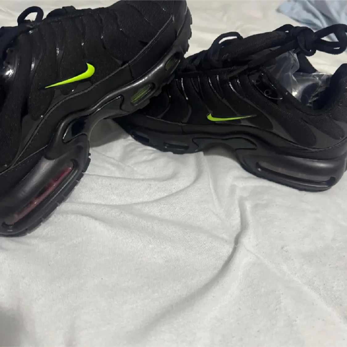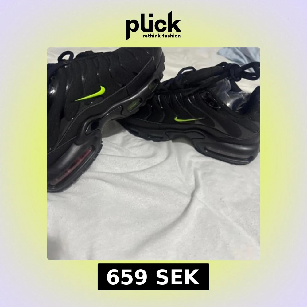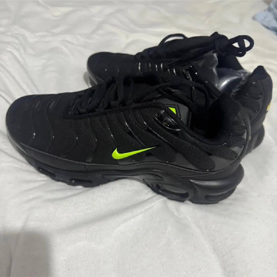 Nike Air Max Plus sneakers i svart med neongröna detaljer och synlig air-sula. Ovandel i mesh och syntet med vågformade paneler, klassisk snörning och tydlig TN-logga under sulan. Snygg kontrast mellan svart och neon, perfekt för dig som gillar streetstyle.
