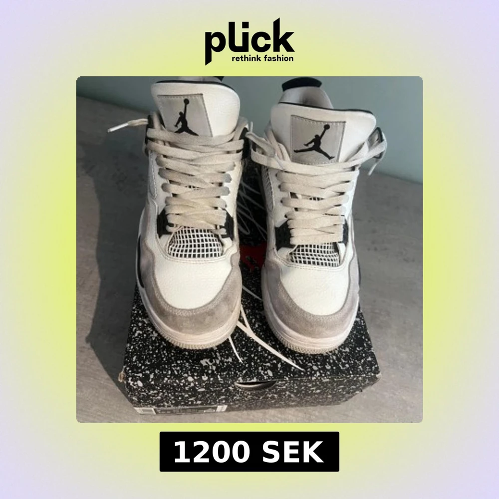 Säljer ett par Nike Air Jordan 4 Retro i vitt, svart och grått. Skorna har klassisk meshpanel, snörning och Jumpman-logga på plös och häl. Stilren design med kontrasterande detaljer och bekväm passform.