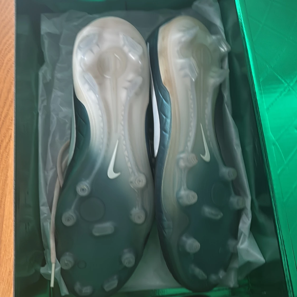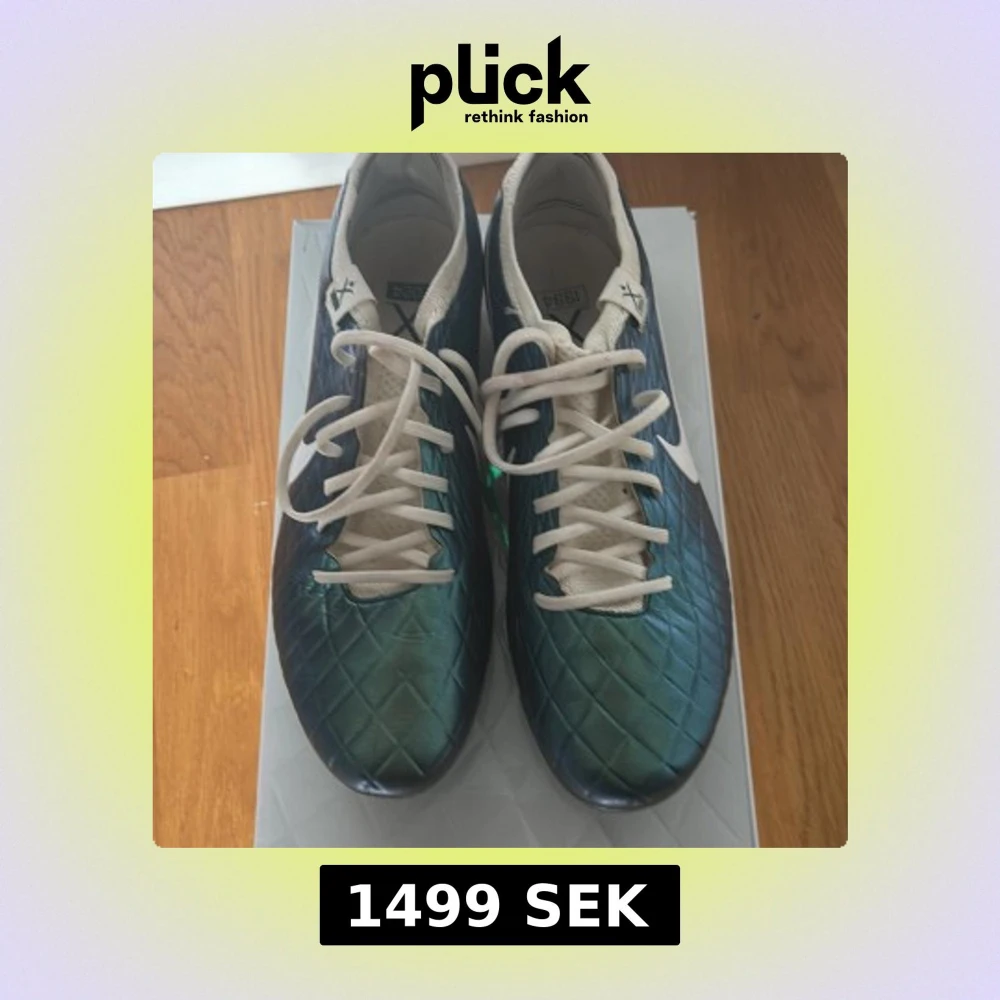 LIMITED EDTION! Snygga fotbollsskor från Nike med grön metallicfärgad ovandel och vita detaljer. Skorna har ett rutmönster på ovandelen, vita snören och vit Nike-logga på sidan. Perfekt för dig som vill sticka ut på planen! Skorna är knappt använda.