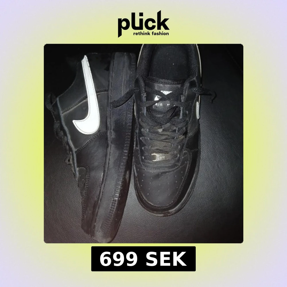 Säljer ett par klassiska svarta Nike Air Force 1 sneakers med vit swoosh. Skorna har rund tå, platt sula och snörning framtill. Perfekta för en streetwear-look och passar till det mesta. Ikonisk design med Nike-logga på sidan. 8/10 skick lite dammiga för dem har inte används på länge små crease som går att få bort dammet får du bort enkelt, små skador på swooshet men märks inte och baksidan är lite creasade