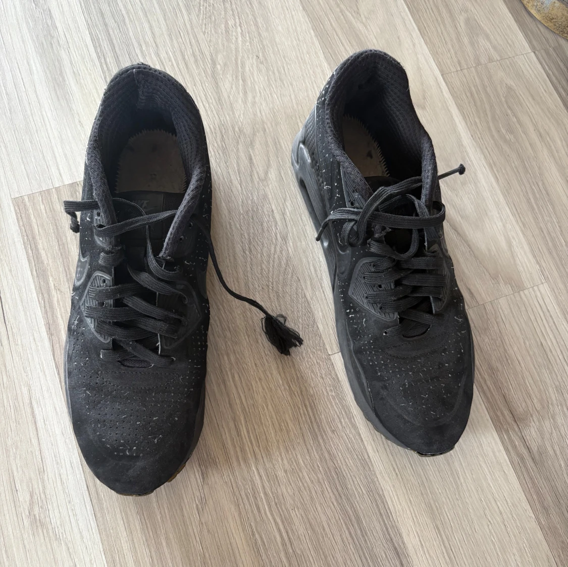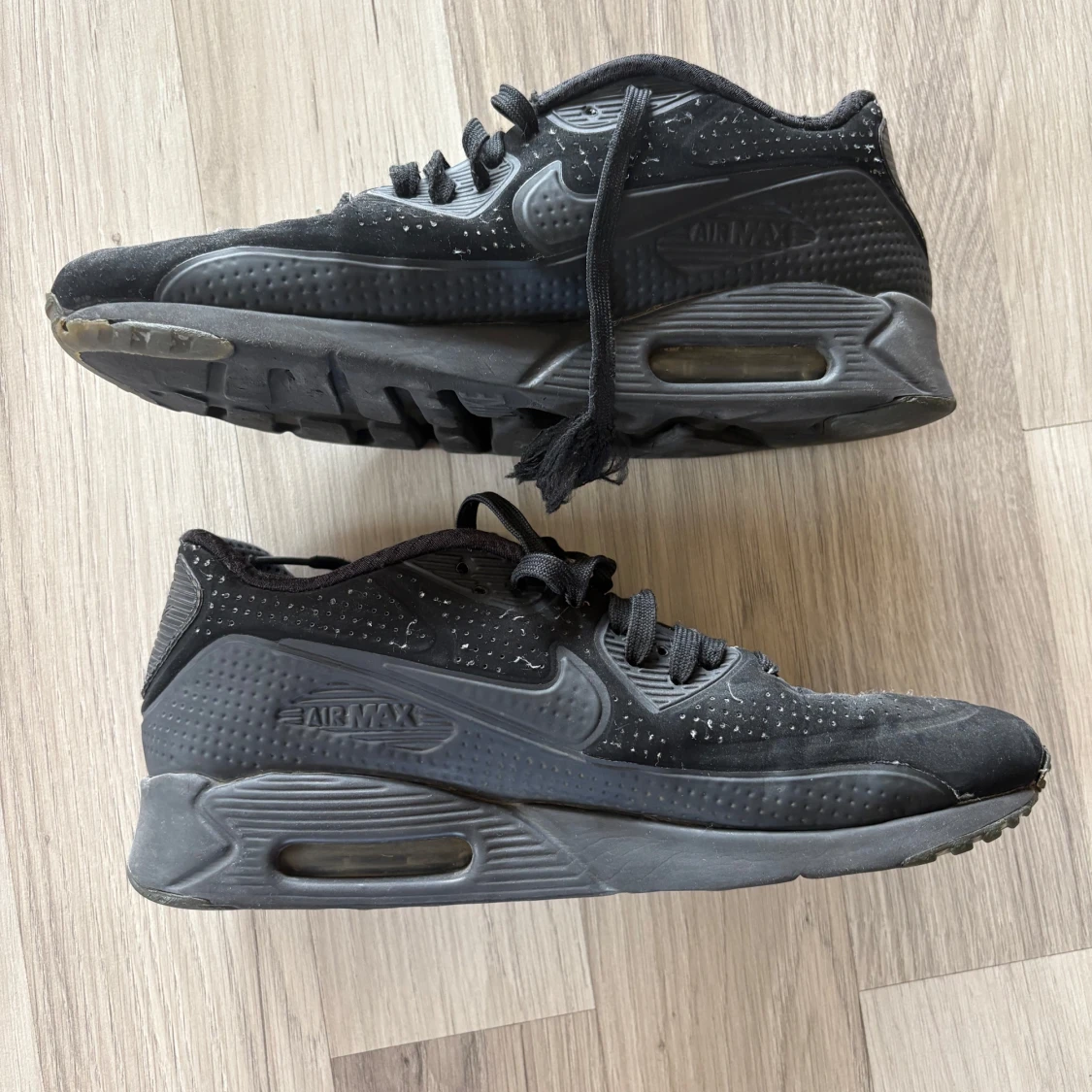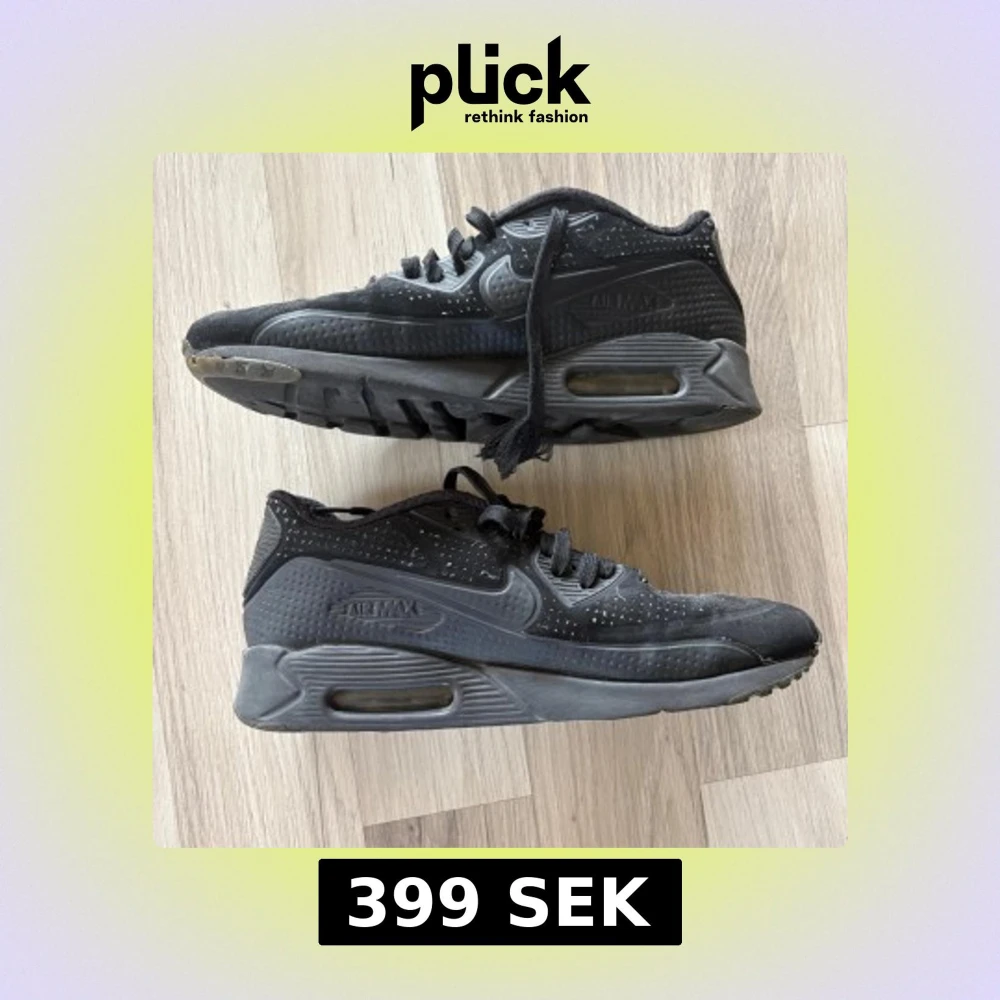 Svarta Nike Air Max sneakers med klassisk synlig luftbubbla i sulan. Skorna har snörning, rund tå och är tillverkade i syntetmaterial med små prickdetaljer över hela ovandelen. Perfekta för dig som gillar en sportig och stilren look.
