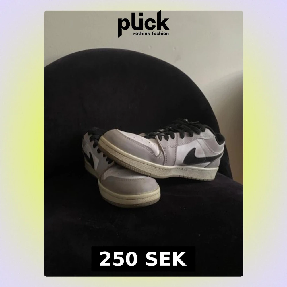 Snygga Nike Air Jordan 1 Low sneakers i grått och vitt med svarta detaljer och svart swoosh. Skorna har svart snörning, rund tå och platt sula. Perfekta för dig som gillar klassisk streetwear och vill ha en stilren look.
