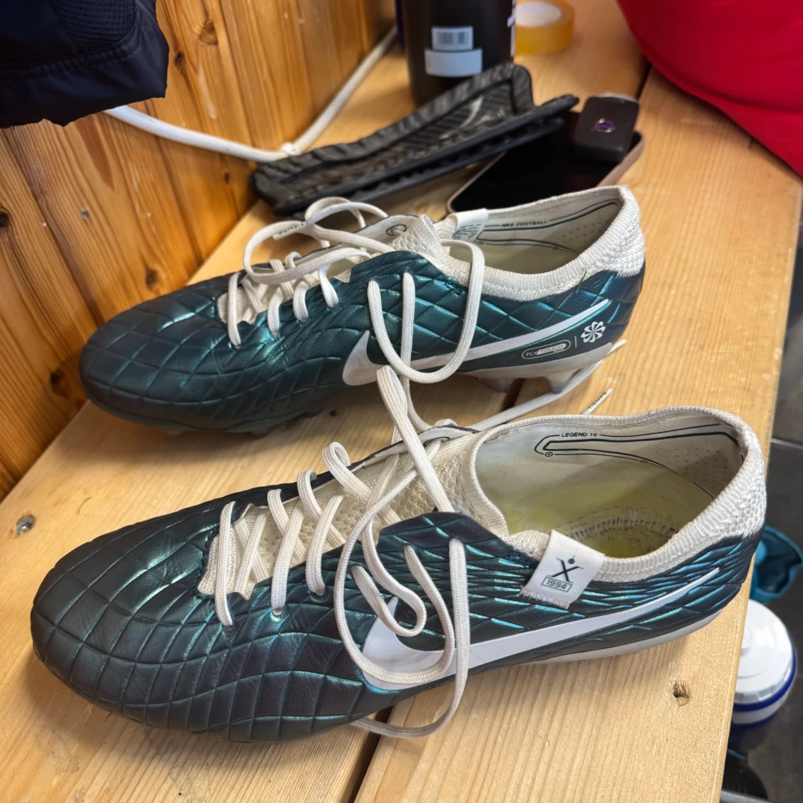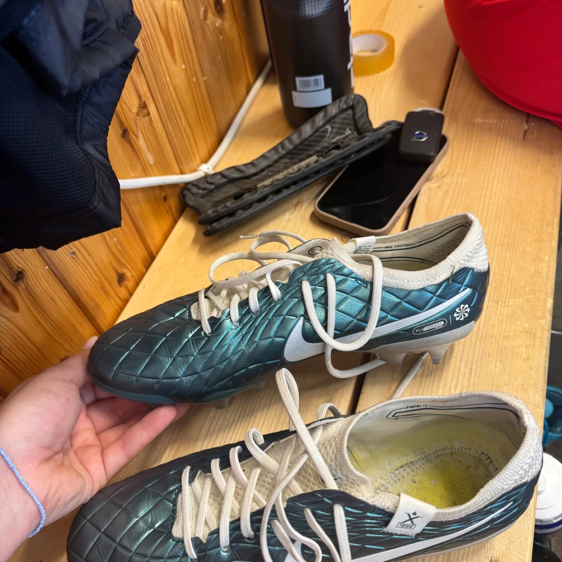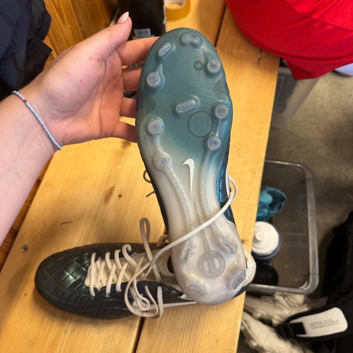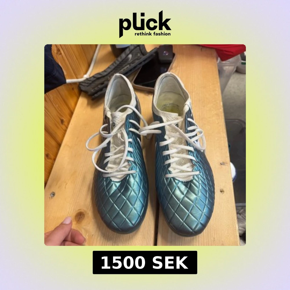 Snygga Nike fotbollsskor i metallicblått med rutmönstrad ovandel och vita detaljer. Skorna har vita snören, vit sula och inslag av mesh vid öppningen för extra komfort. Perfekta för dig som vill sticka ut på planen. Använda 2 gånger! Nypris 3100kr,2024 årsmodell .