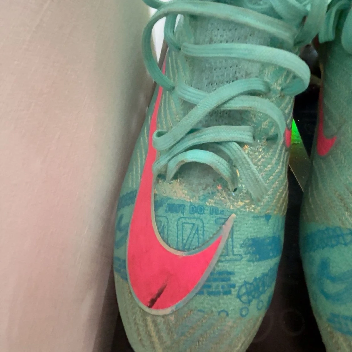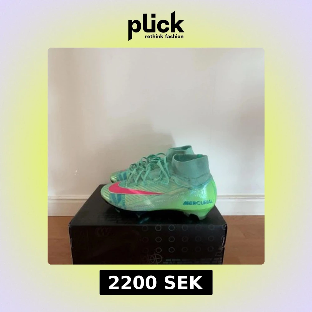 Nike Mercurial fotbollsskor i en fräsch turkos färg med neonrosa detaljer och stora loggor. Skorna har snörning, hög strumpkrage och mönstrad ovandel i syntetmaterial. Perfekta för dig som vill sticka ut på planen med stil. Ända defekten är fläcken på bild 4 men annars helt felfria!