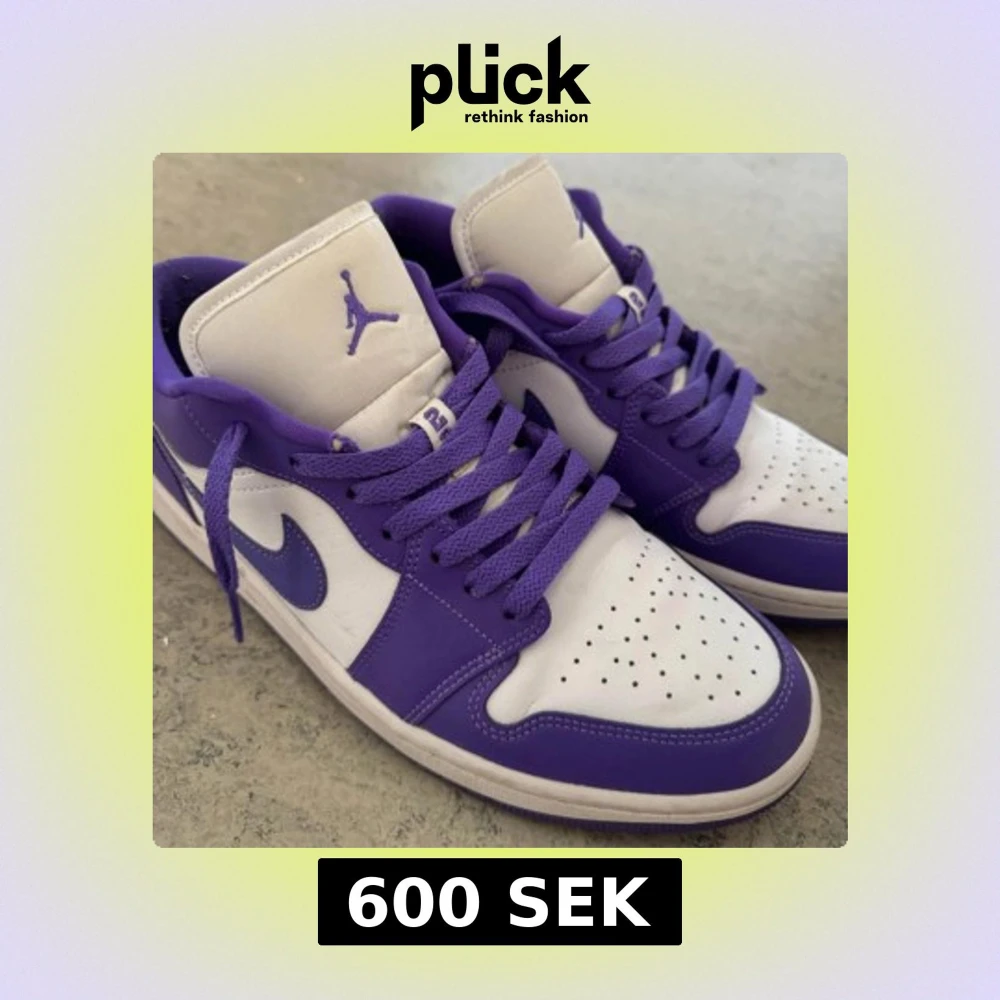 Säljer ett par Nike Air Jordans i lila och vitt. Skorna har klassisk låg modell med perforerad tå, lila snörning och tydlig Jumpman-logga på plösen. Perfekta för dig som vill sticka ut med färg på fötterna.