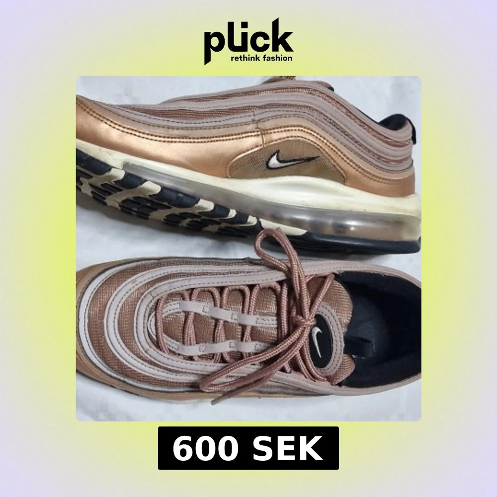 Säljer ett par Nike Air Max 97 sneakers i snygg roséguld och beige med ikoniska vågiga linjer och synlig luftbubbla i sulan. Skorna har snörning och svart detalj på insidan. Perfekta för dig som vill sticka ut med stilrena och trendiga sneakers.