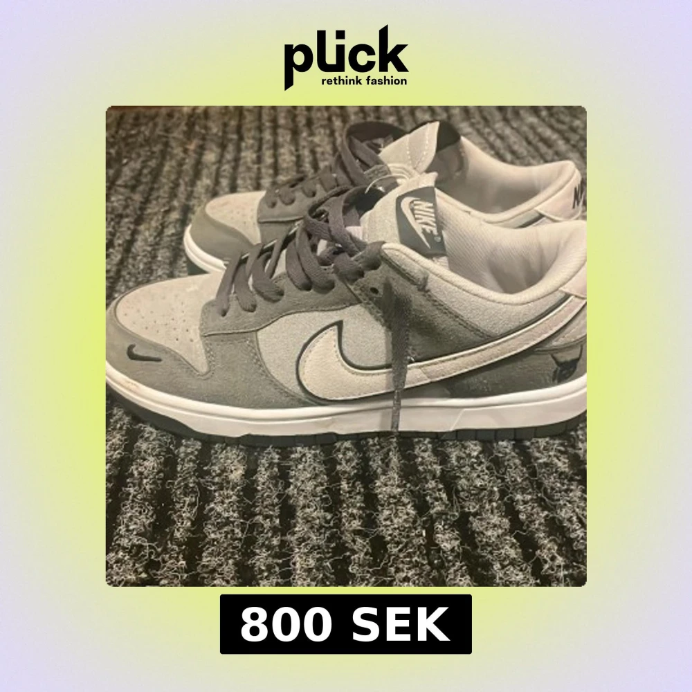 Snygga grå Nike sneakers med vit sula och svart Nike-logga. Skorna har snörning och är tillverkade i mocka och syntetmaterial. Perfekta för en stilren look.