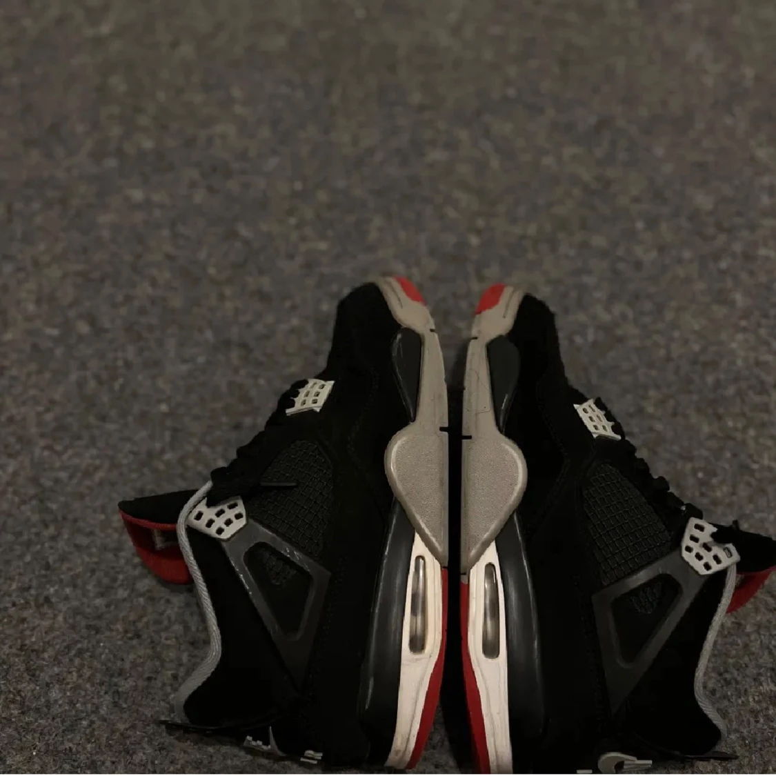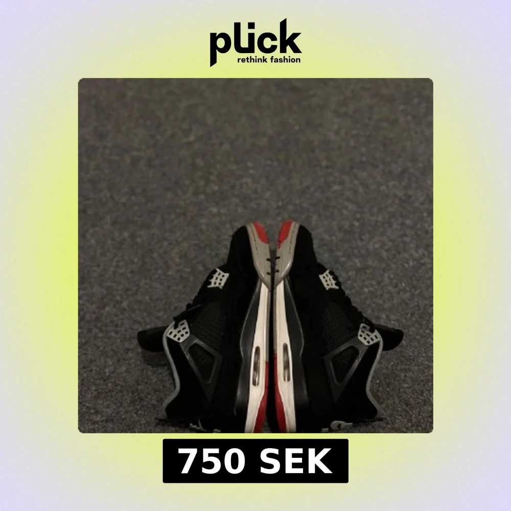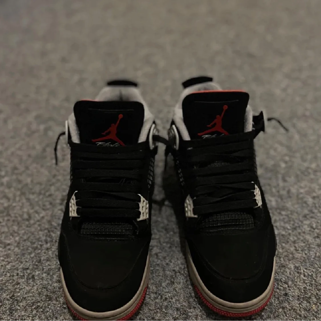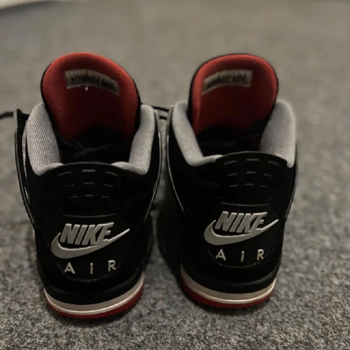 Säljer ett par Nike Air Jordan 4 i svart med röda och grå detaljer. Skorna har klassisk meshpanel, snörning och den ikoniska Jumpman-loggan på plösen. Snygg kontrast mellan svart mocka och gråa samt röda inslag på sulan. Perfekta för dig som gillar streetwear och sneakers med attityd.