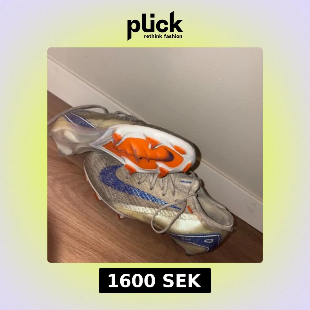 Unika Nike Air Zoom fotbollsskor i Bowerman Prototype edition. Skorna har en skimrande beige ovandel med blå Nike-swoosh och detaljer, samt orange och vit sula med dobbar. Lätta och snabba med snörning, levereras med original vit/blå Bowerman Prototype-påse.