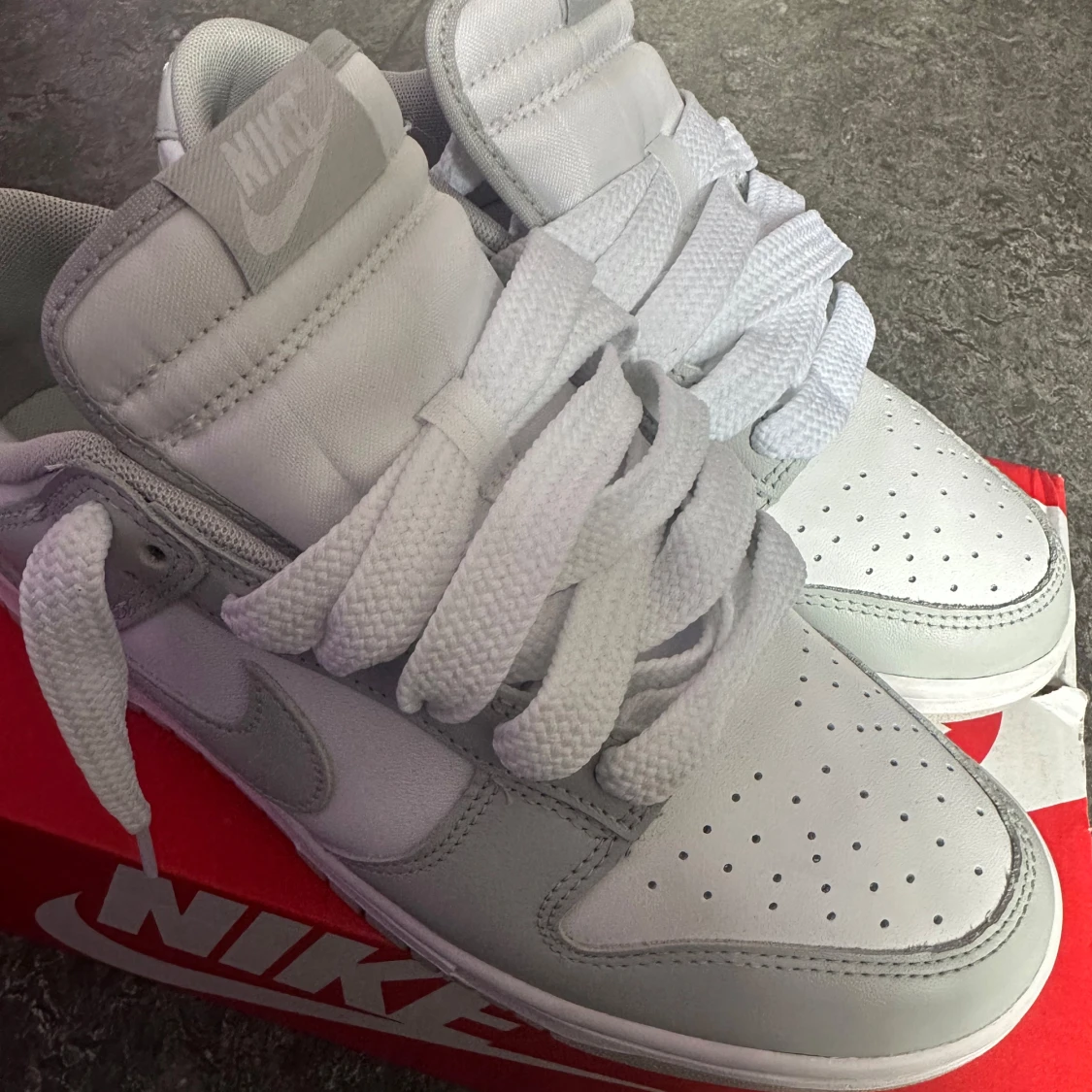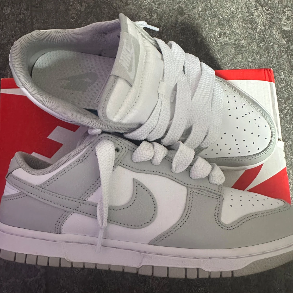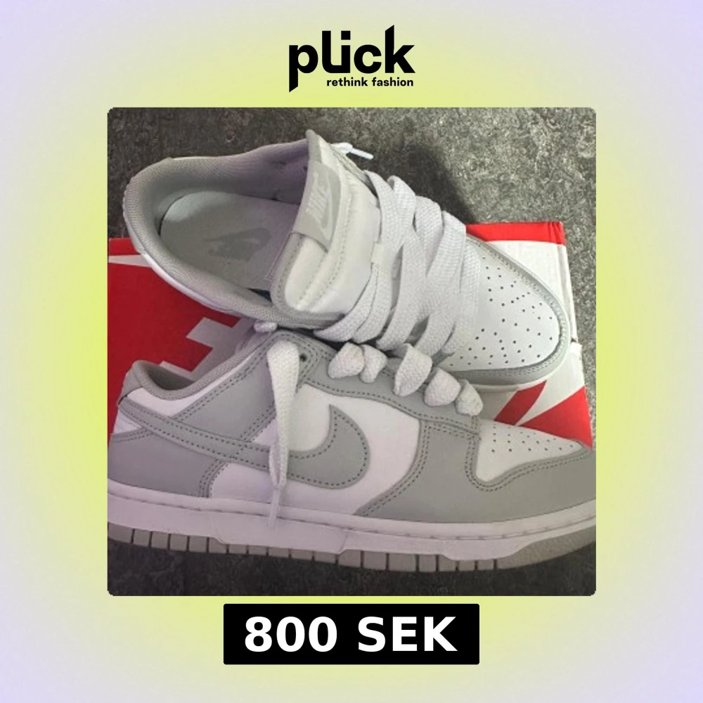 Hej, säljer dessa tvärfeta skor från Nike dunks kollektionen. De är bara använda en gong och sitter på storlek 42 i mäns storlekar. De är specialgjorda med extra stora vita snören vilket gör de lite mer loose, alltså skönare. För mer bilder kan ni gärna skriva, priset kan även diskuteras.