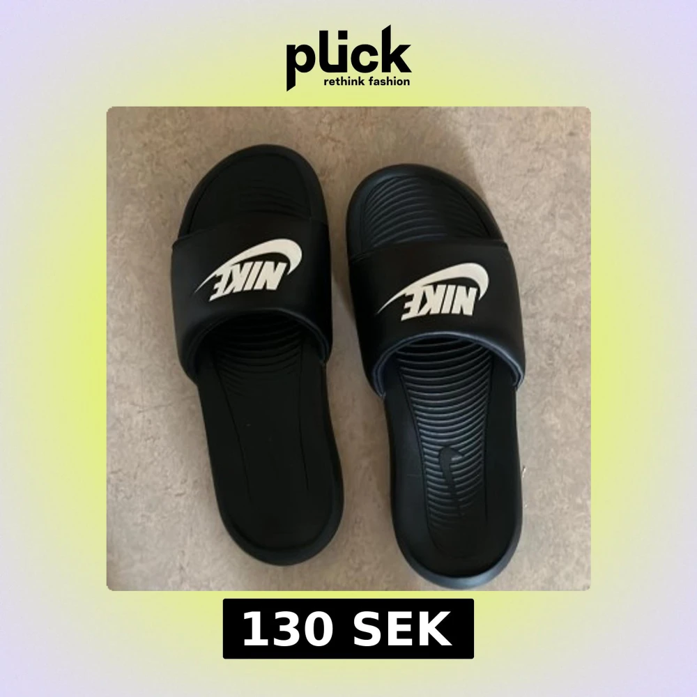 Svarta sandaler från Nike med klassisk vit logga på ovandelen. Skorna har en bred rem över foten och räfflad sula för extra grepp. Tillverkade i syntetmaterial och perfekta för sommaren eller efter träningen.