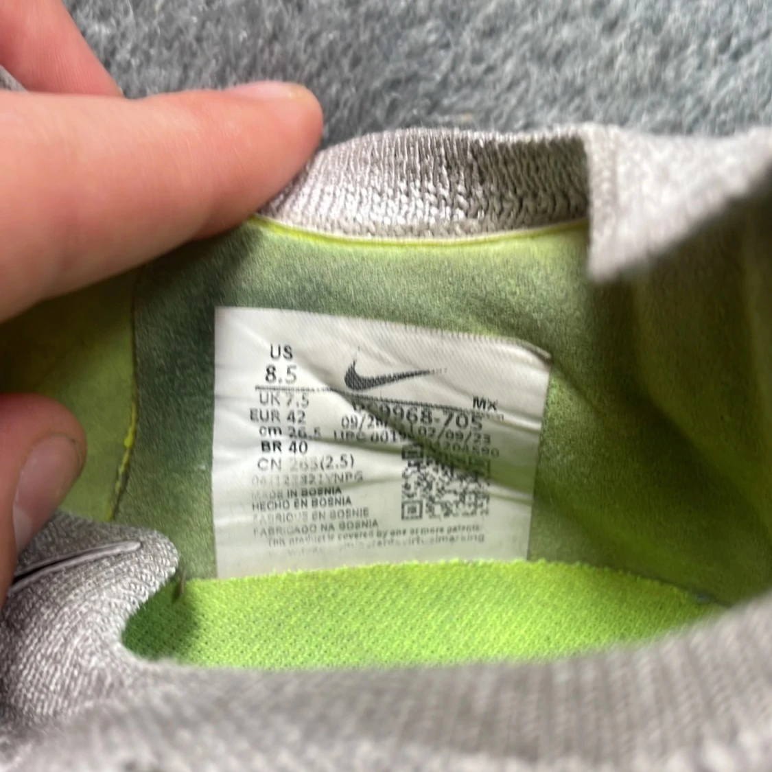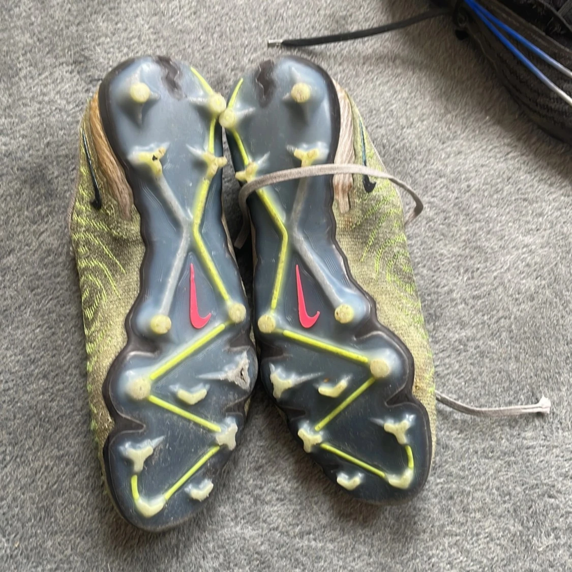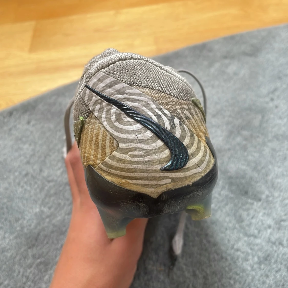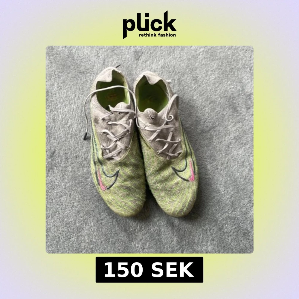 Nike Phantom GX fotbollsskor i grått och ljusgrönt med svarta och rosa detaljer. Ovandel i stickad syntet med spiralformade mönster, snörning och rund tå. Yttersula med fasta dobbar och rosa Swoosh-logga undertill. Perfekta för dig som vill sticka ut på planen.väldigt använde säljer till ett bökigt pris