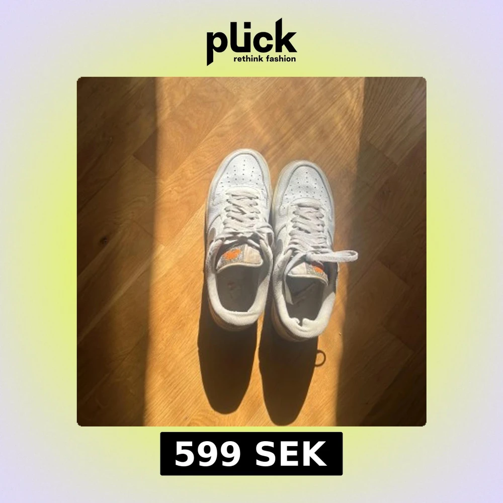Klassiska Nike Air Force 1 sneakers i vitt skinn med orange detaljer på tungan och hälen. Pris kan allltid diskuteras vid snabb affär!