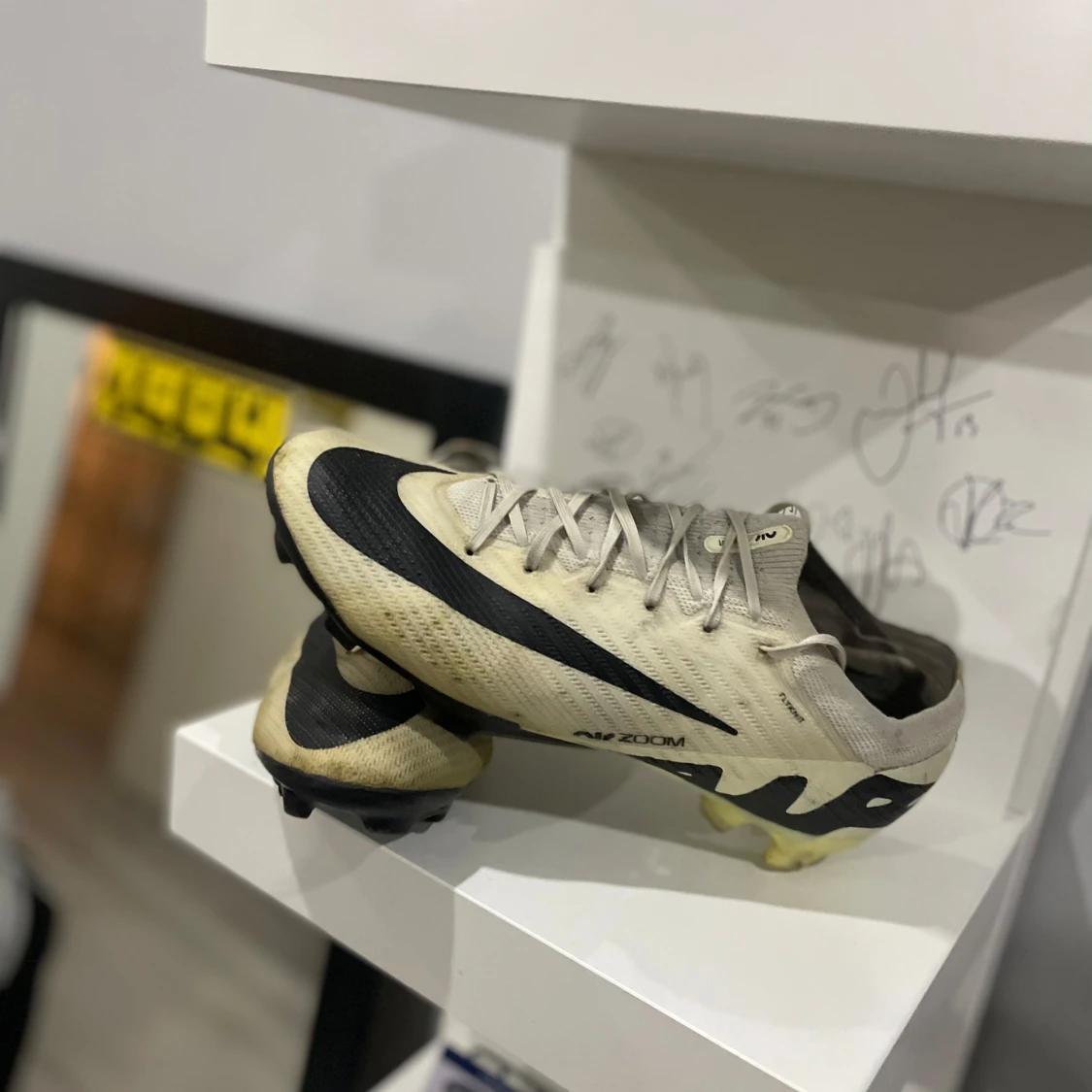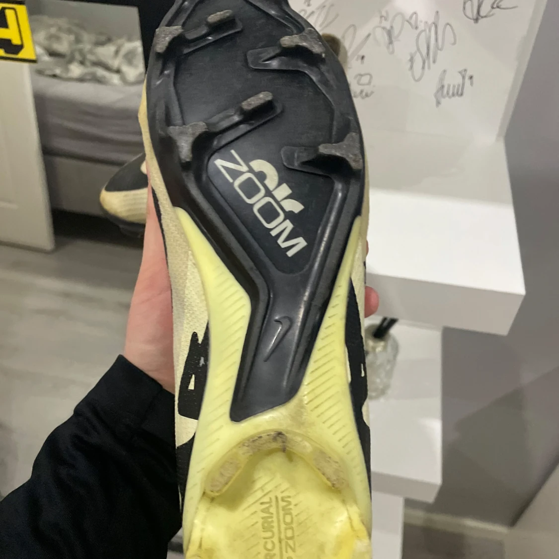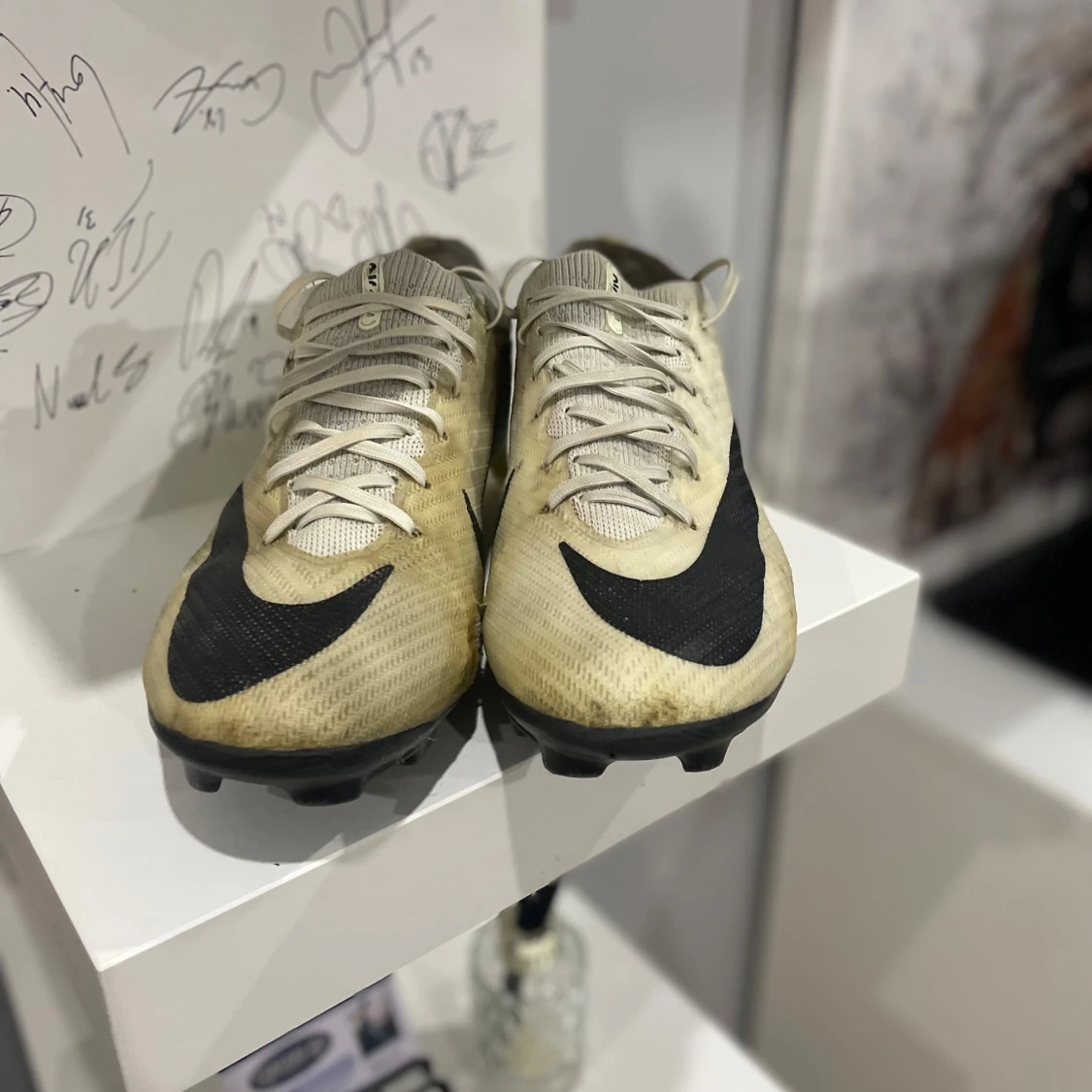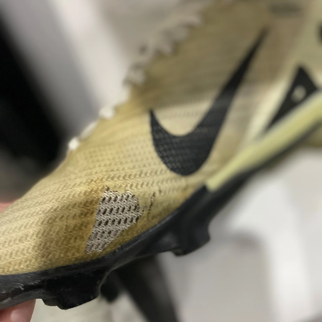 Snygga beige fotbollsskor från Nike med svart swoosh och snörning. Skorna har en sportig design med en slitstark sula, perfekt för fotbollsplanen.