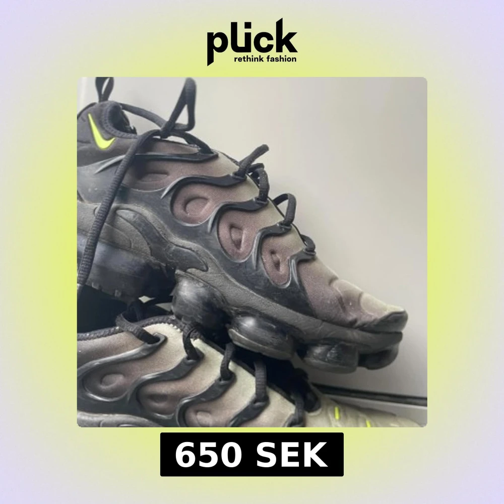 Nike Air Vapormax Plus sneakers i svart och grått med neon-gula detaljer. Snygg vågig design på ovansidan, synlig Vapormax-sula och snörning. Materialet är syntet och textil, med en futuristisk vibe och coola detaljer som sticker ut.