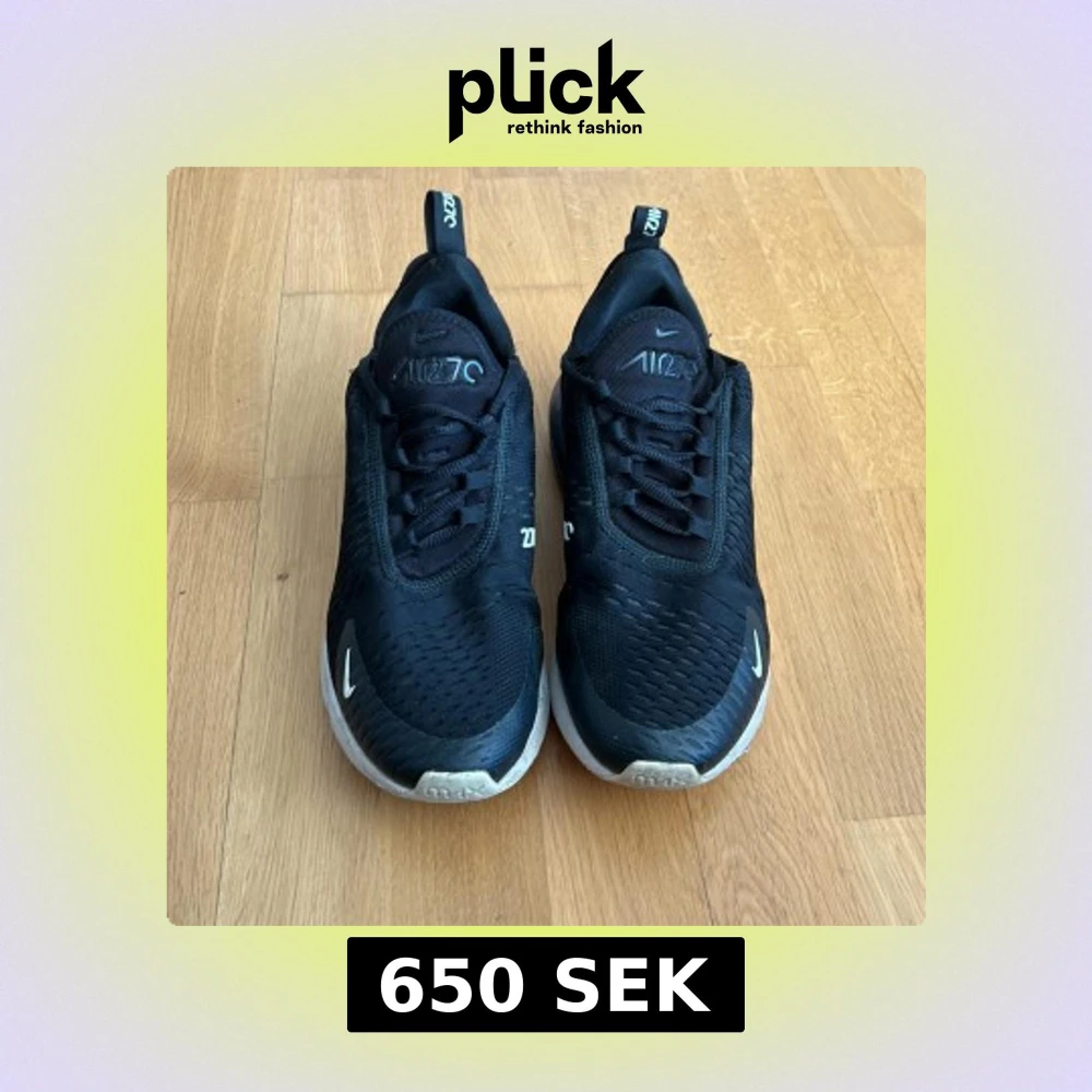 Säljer ett par svarta Nike Air Max 270 med vit sula och synlig Air-enhet i hälen. Skorna har en modern design med snörning och Nike-logga på sidan. Perfekta för både stil och komfort.