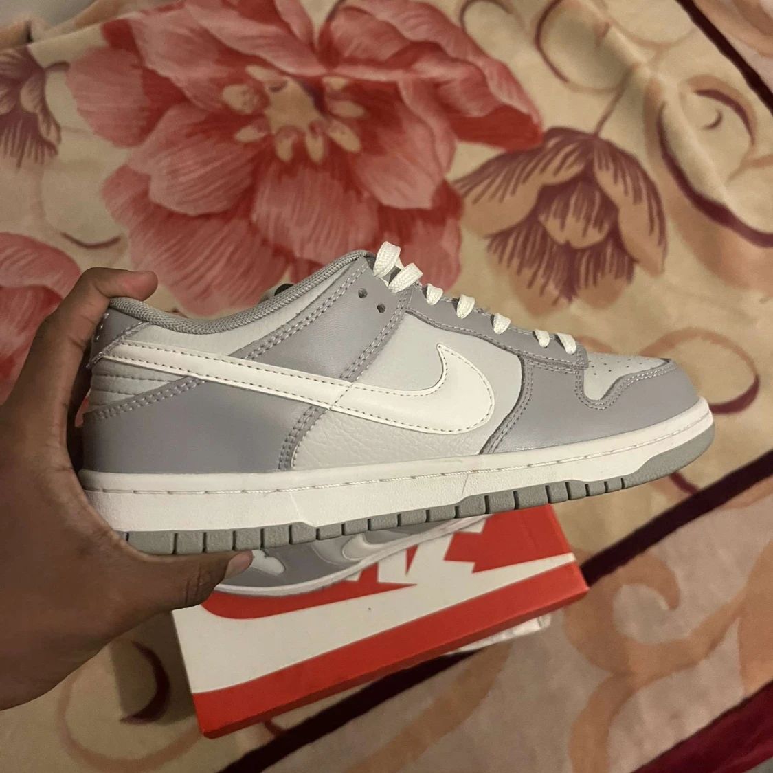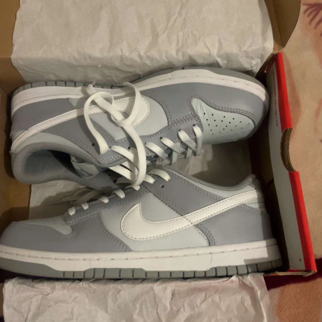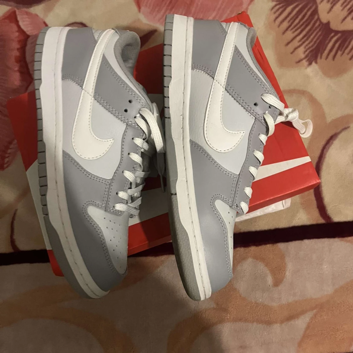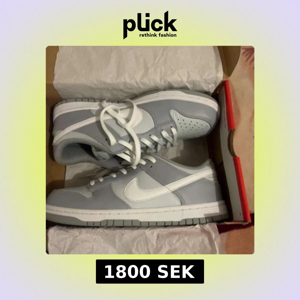 Nike Dunk Low sneakers i stilren grå och vit färg. Skorna har klassisk låg siluett, vit sula och snörning. Tillverkade i skinn med mjuk vadderad plös och ikonisk Swoosh-logga på sidorna. Perfekta för dig som gillar clean och modern streetstyle.
