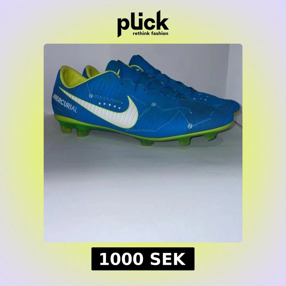 Snygga Nike Mercurial fotbollsskor i blått med limegröna detaljer och vit swoosh. Skorna har snörning, låg profil och platt sula med dobbar för gräsplan. Insidan är limegrön och materialet är syntet för lätt vikt och bra grepp på planen.