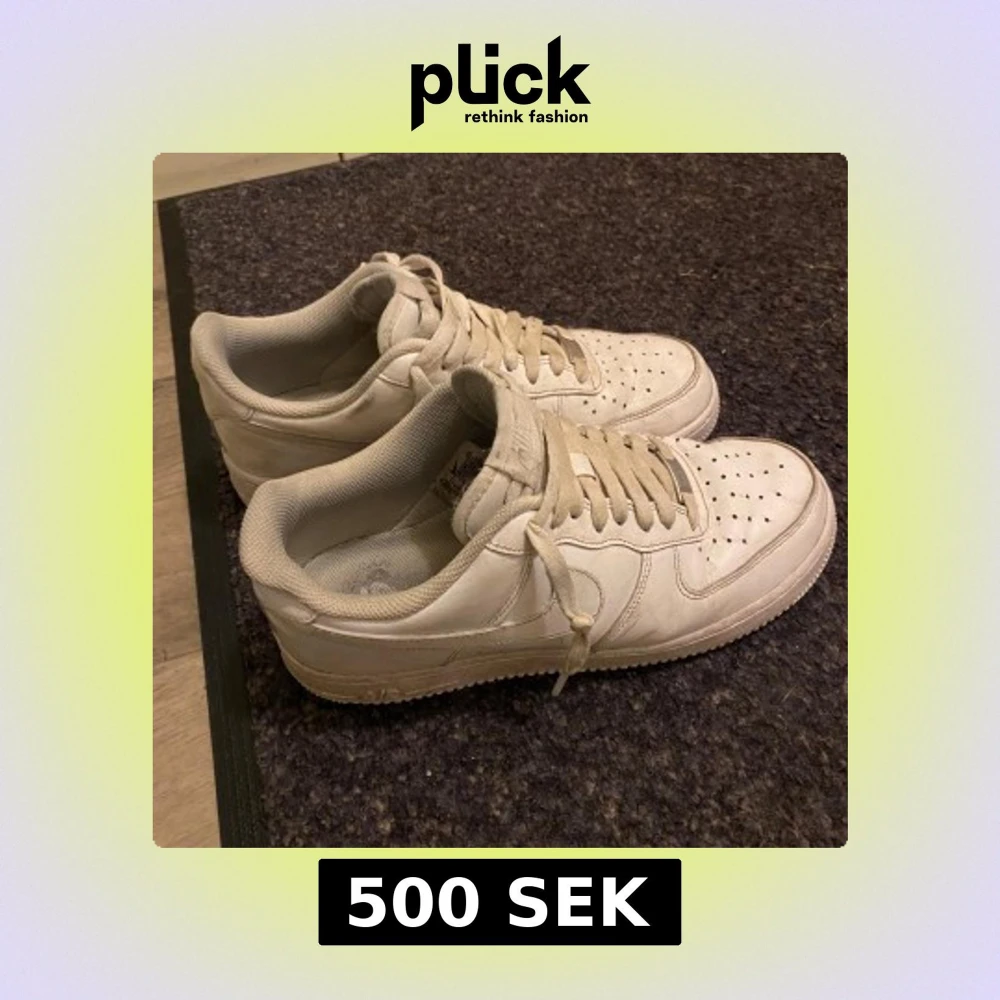 Säljer ett par klassiska vita Nike Air Force sneakers. Skorna har en stilren design med snörning och perforerade detaljer på ovansidan för ventilation. Perfekta för en avslappnad och sportig look.