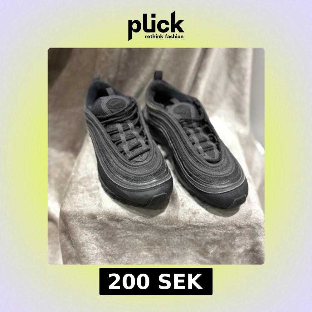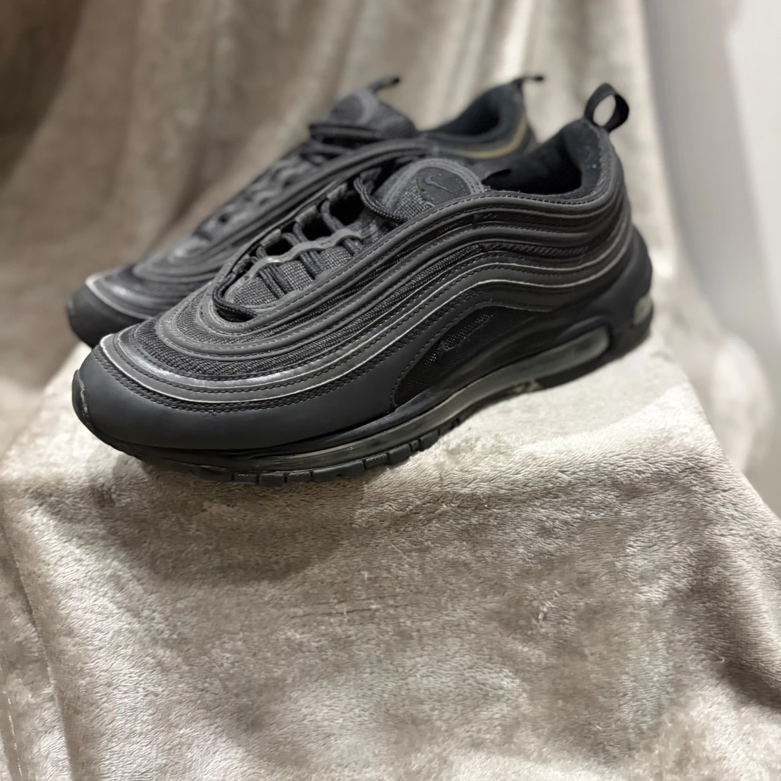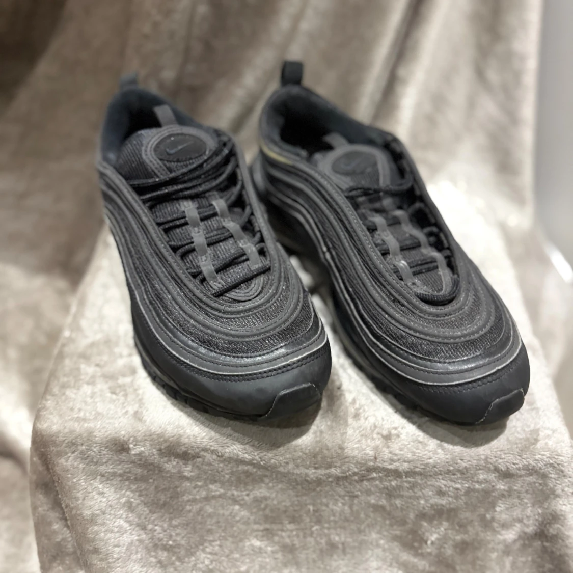 Säljer ett par Nike Air Max 97 i helsvart färg. Skorna har den ikoniska vågiga designen, synlig Air Max-sula och snörning. Tillverkade i en mix av syntet och textil med detaljer i skinn. Perfekta för dig som gillar en clean och sportig look.