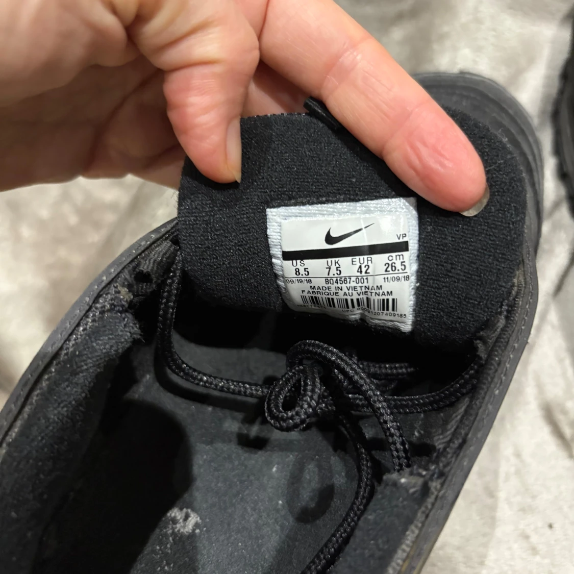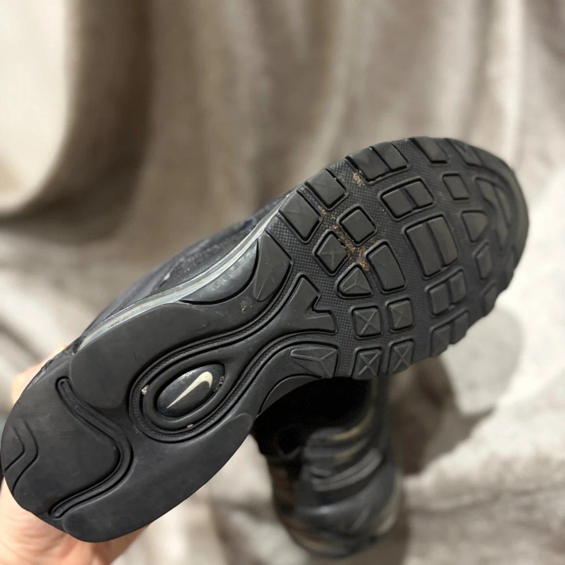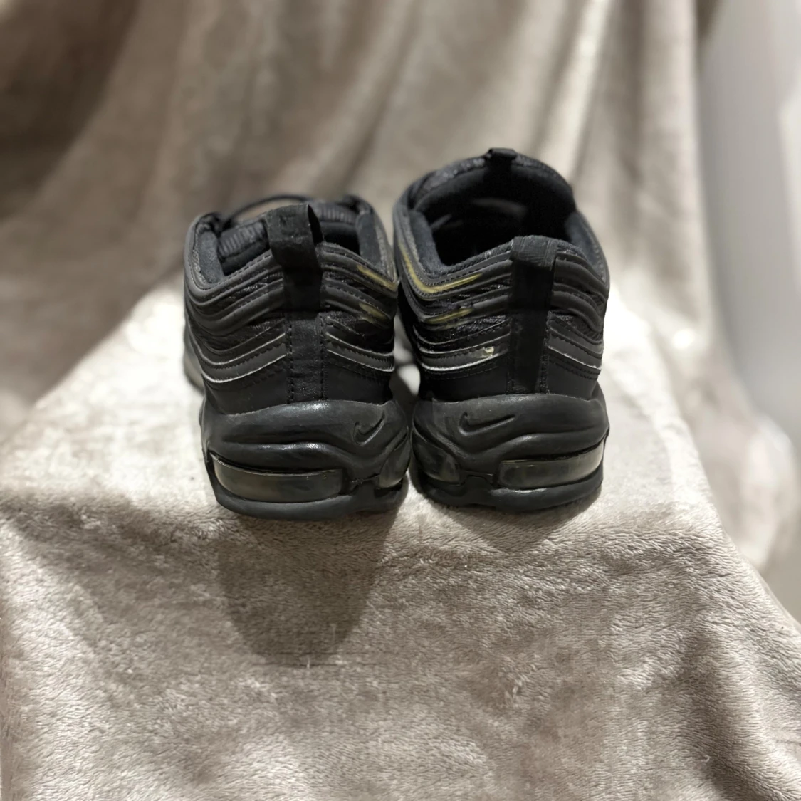 Säljer ett par Nike Air Max 97 i helsvart färg. Skorna har den ikoniska vågiga designen, synlig Air Max-sula och snörning. Tillverkade i en mix av syntet och textil med detaljer i skinn. Perfekta för dig som gillar en clean och sportig look.