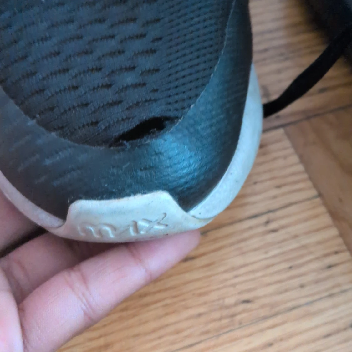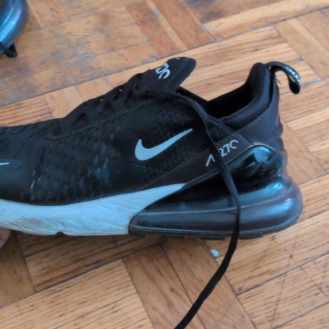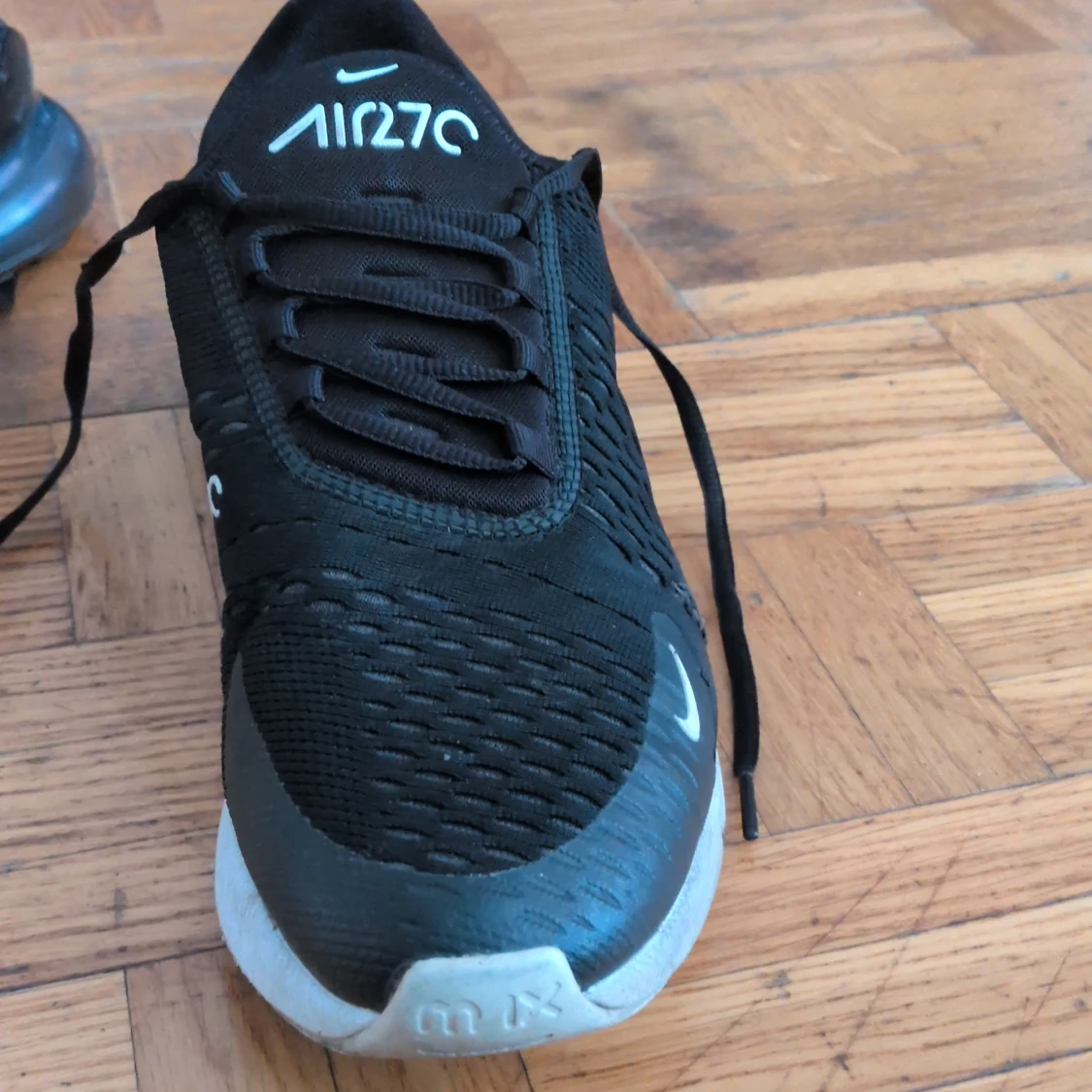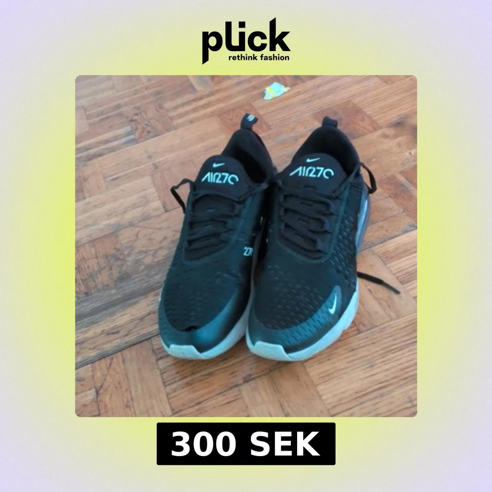 Svarta Nike Air Max 270 sneakers med vit sula och tydlig Air Max-bubbla i hälen. Ovandelen är i mesh och syntet, med snörning och diskreta vita loggor. Skorna har en sportig vibe och passar perfekt till streetwear eller träning.