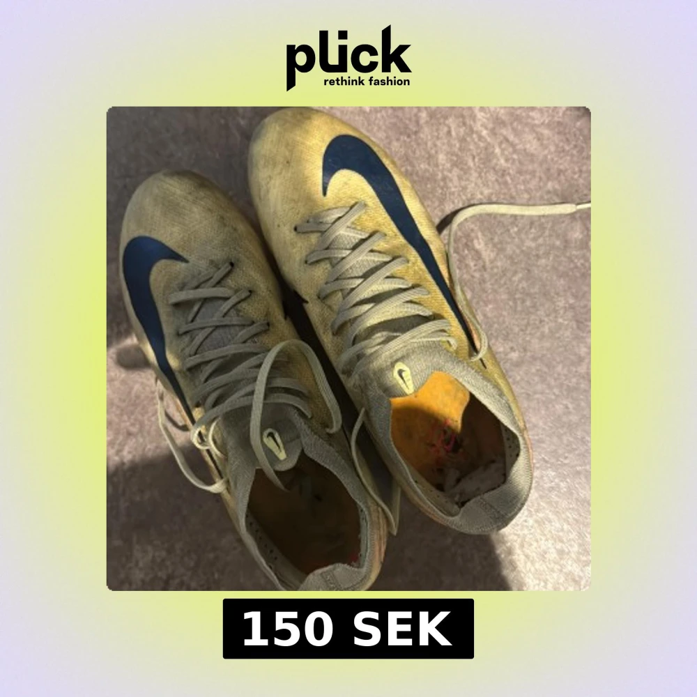 Säljer ett par Nike fotbollsskor i gulbeige med stora blå swoosh-loggor på sidorna. Skorna har snörning och är tillverkade i ett lätt syntetmaterial som ger bra känsla på planen. Perfekta för dig som vill sticka ut med stil på matchen.