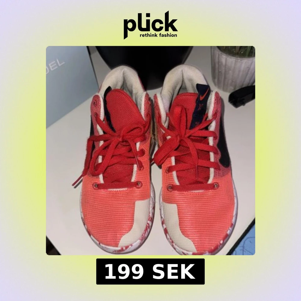 Säljer ett par Nike KD sneakers i rött och beige med svart swoosh på sidan. Skorna har snörning och en unik rödvit mönstrad sula med KD-logga. Ovandelen är i ventilerande syntetmaterial och insidan är mjukt vadderad för extra komfort. Tyvärr var karlborren gått av men skorna funkar fortfarande utmärkt. Storlek 42